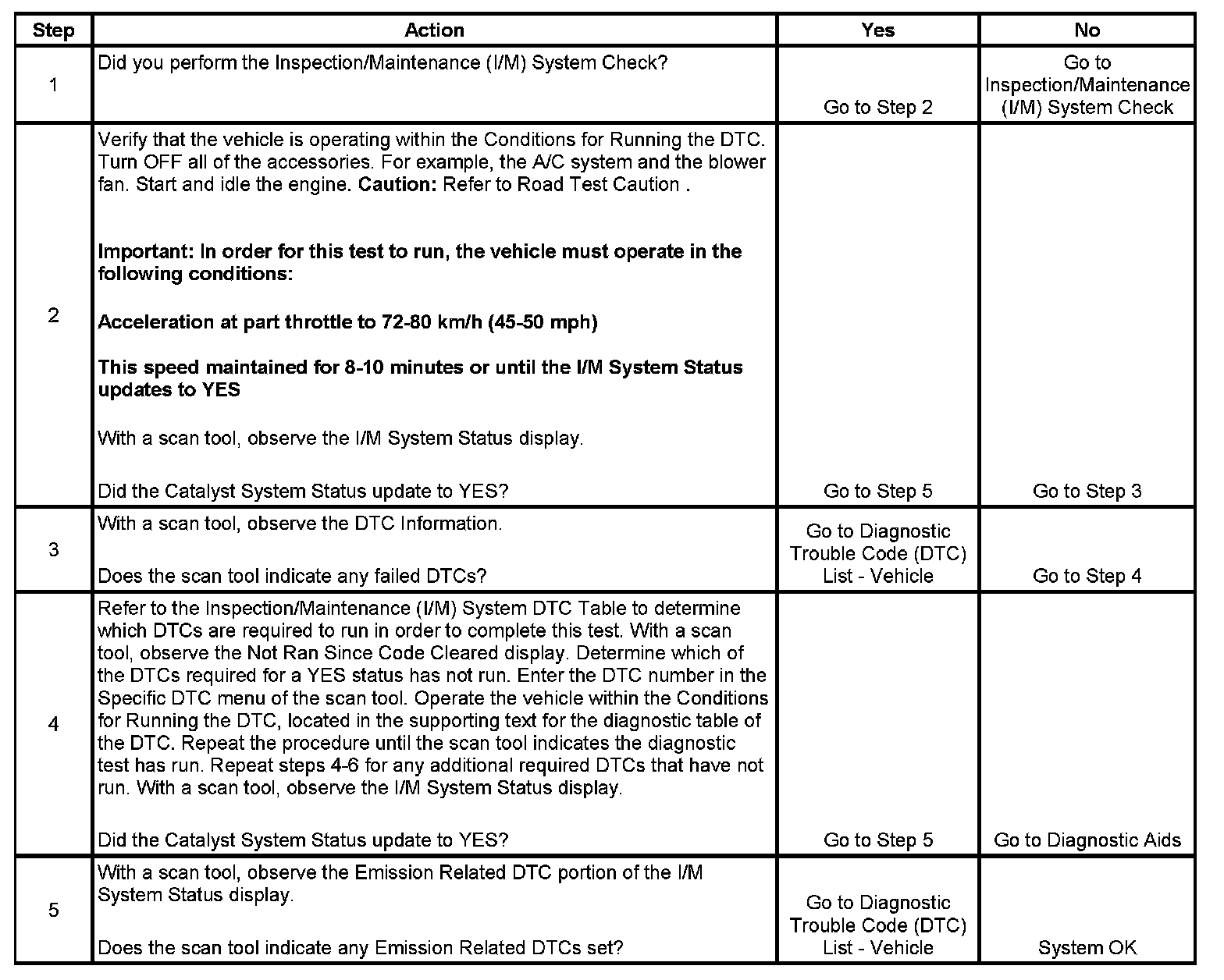 3. This step is to identify a first failure of a type B DTC. A DTC only appears on the I/M System Status display when it becomes a MIL illuminating DTC. This occurs on the second failure of a type B DTC. A first failure of a type B DTC will not allow the I/M System Status to update to YES. Refer to Diagnostic Aids.