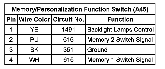 Memory/Personalization Function Switch (A45)