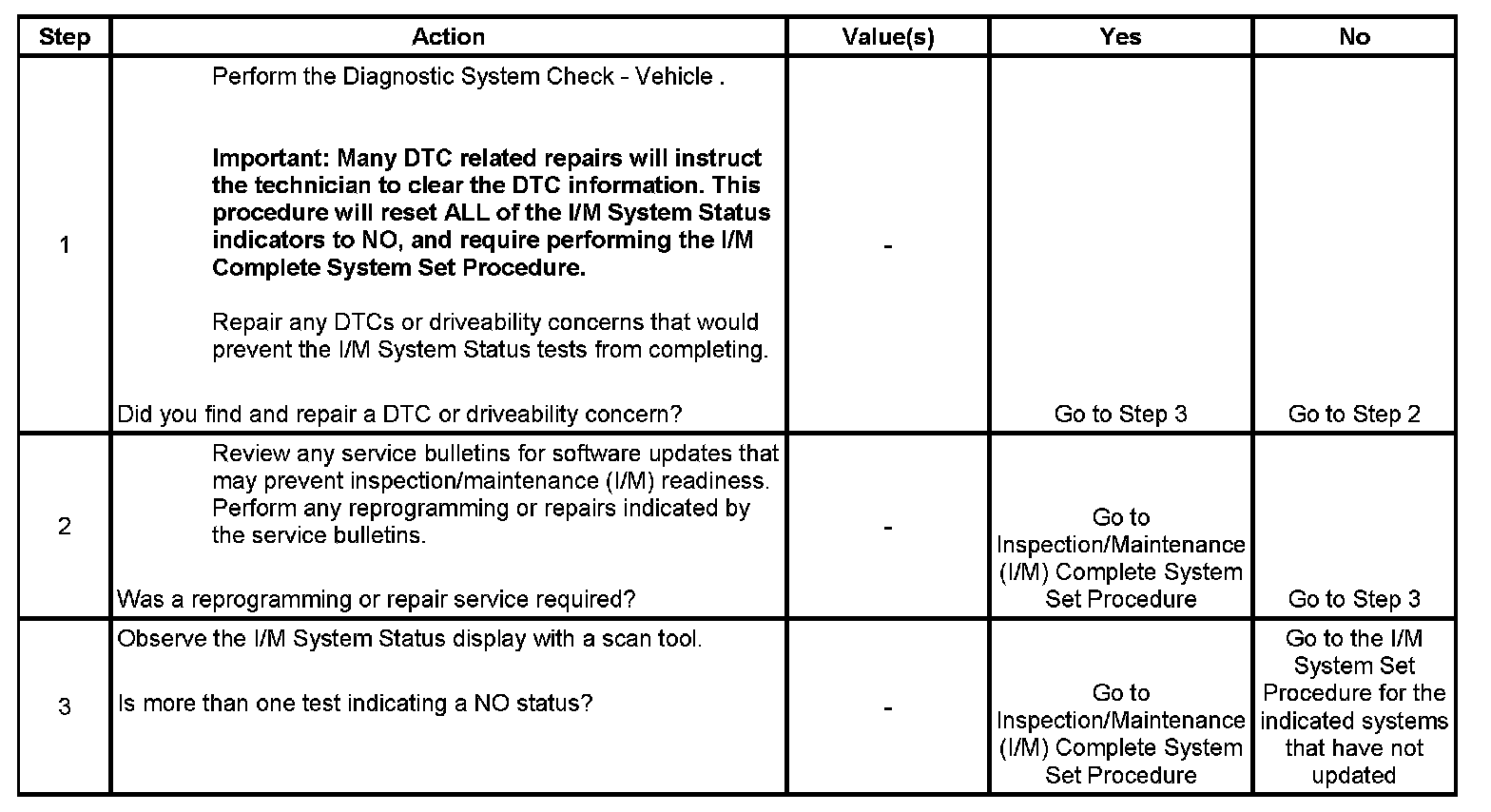 For the specific DTCs required for each system, Refer to Inspection/Maintenance (I/M) System DTC Table. Systems such as fuel delivery, misfire, and comprehensive components may not be listed in a system status list. These tests run continuously and do not require an I/M System Status indicator. Inspection/Maintenance (I/M) System DTC Table