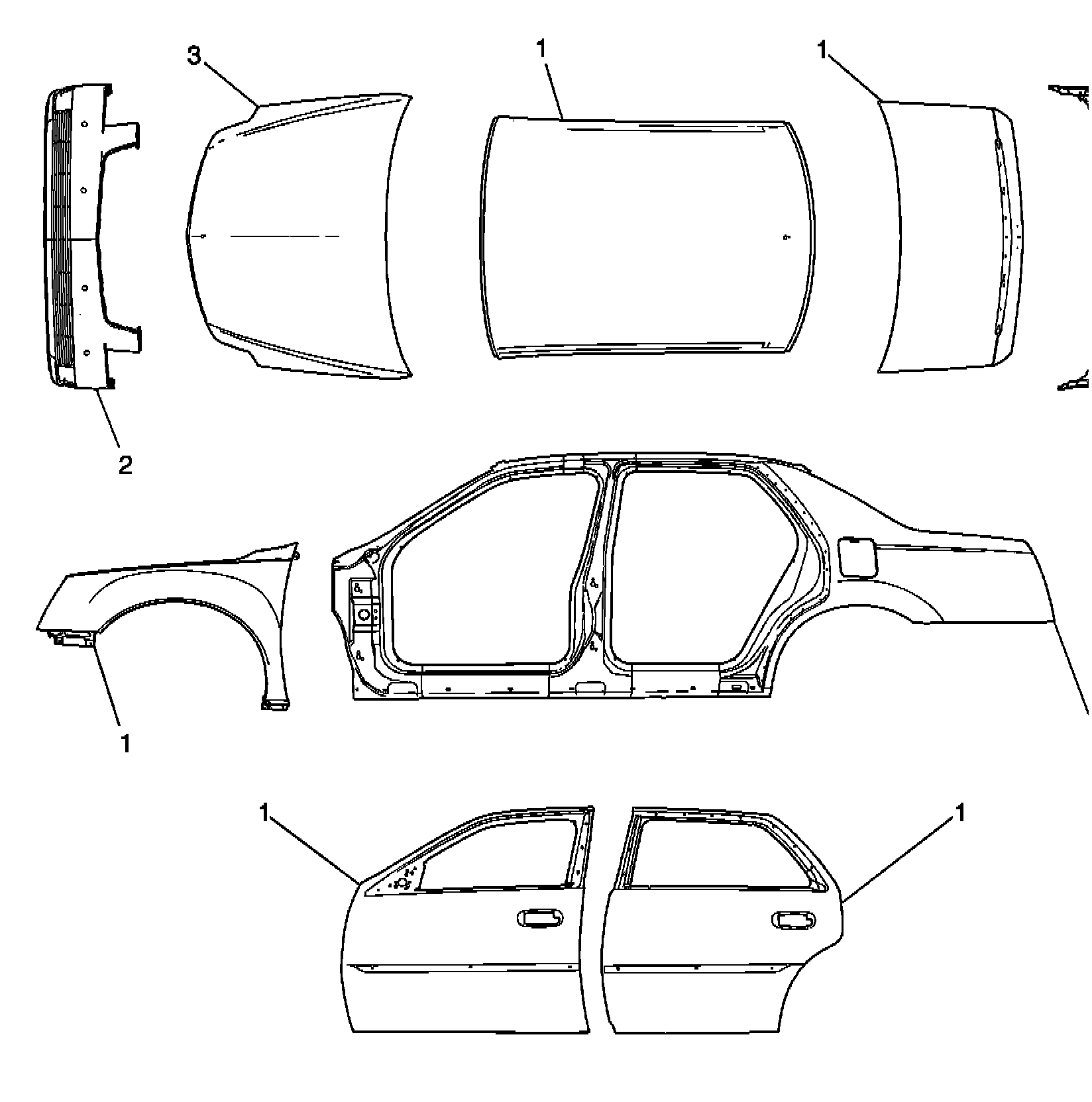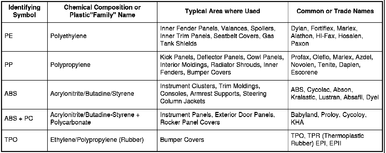 Panel IdentificationExterior body panels are constructed of various materials. This is due to increased dent and corrosion resistance of modern composites. All vertical panels: fenders, doors, quarter and rocker panels, roof, and deck are made from rigid steel. Front and rear fascias and bumper covers are constructed of thermoplastic olefin (TPO). The hood is aluminum.