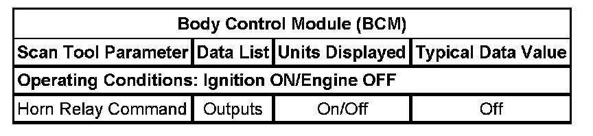 The Horns Scan Tool Data List contains all of the horn related parameters that are available on the scan tool. The parameters in the list are arranged in alphabetical order. The column, Data List, indicates the location of the parameter within the scan tool menu selections. Use the Horns Scan Tool Data List as directed by a diagnostic table or in order to supplement the diagnostic procedures. Begin all of the diagnostic procedures with Diagnostic System Check - Vehicle. Initial Inspection and Diagnostic Overview