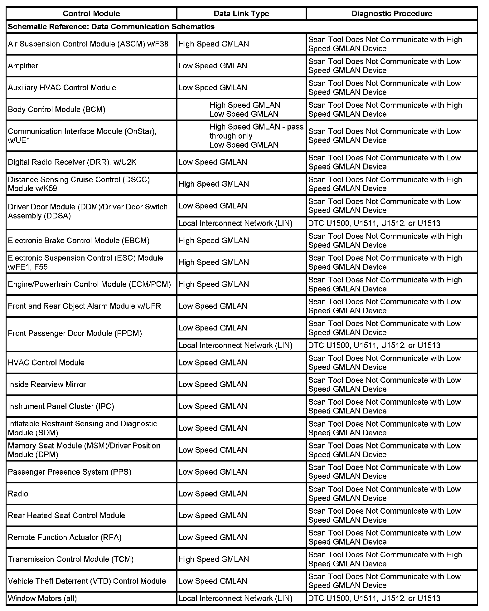 This table identifies which serial data link that a particular module uses for in-vehicle data transmission. Some modules may use more than one data link to communicate. Some modules may have multiple communication circuits passing through them without actively communicating on that data link. This table is used to assist in correcting a communication malfunction. For the description and operation of these serial data communication circuits refer to Data Link Communications Description and Operation.