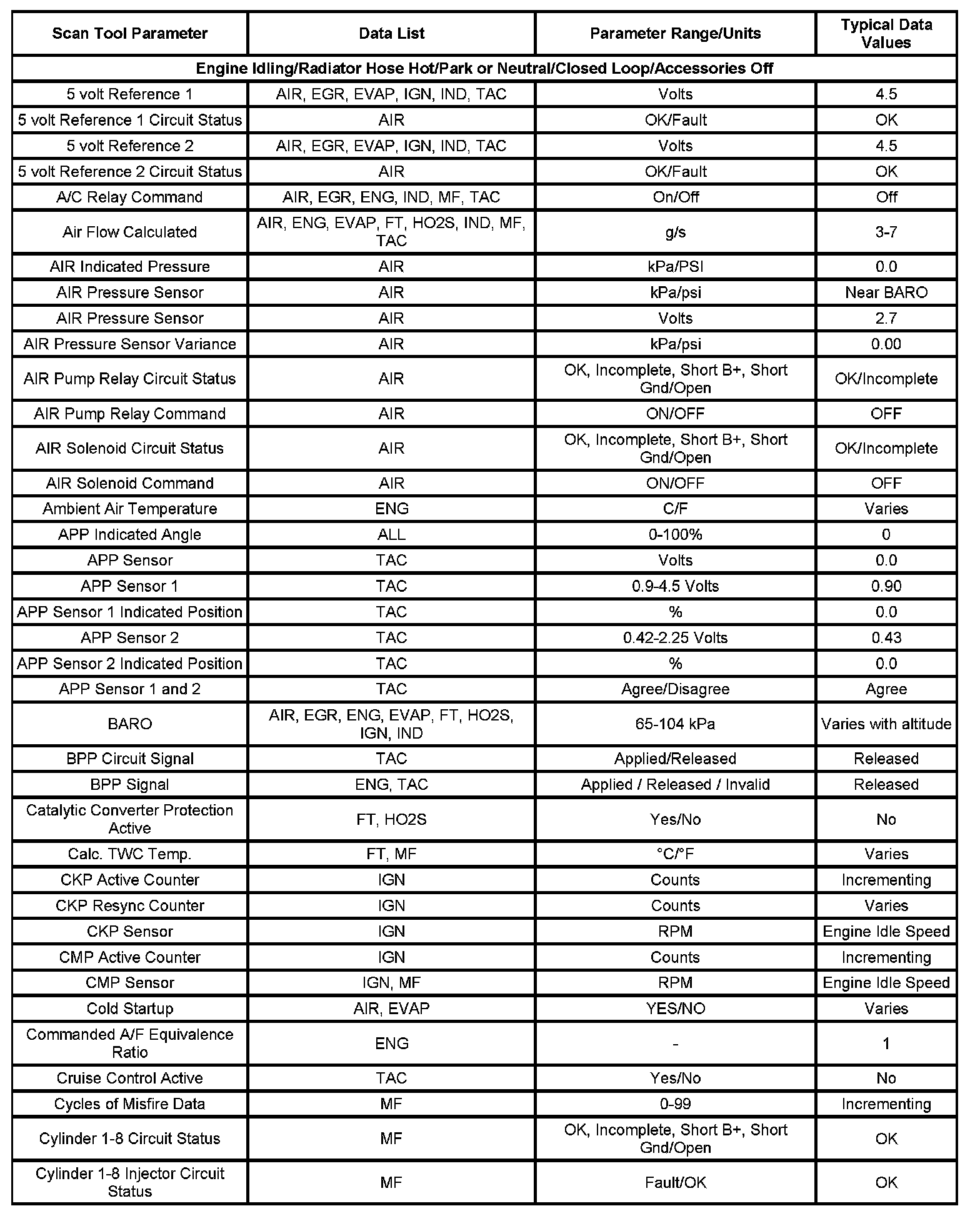 The Engine Scan Tool Data List contains all engine related parameters that are available on the scan tool. The list is arranged in alphabetical order. A parameter may appear in any one of the data lists, and in some cases may appear more than once, or in more than one data list in order to group certain related parameters together.