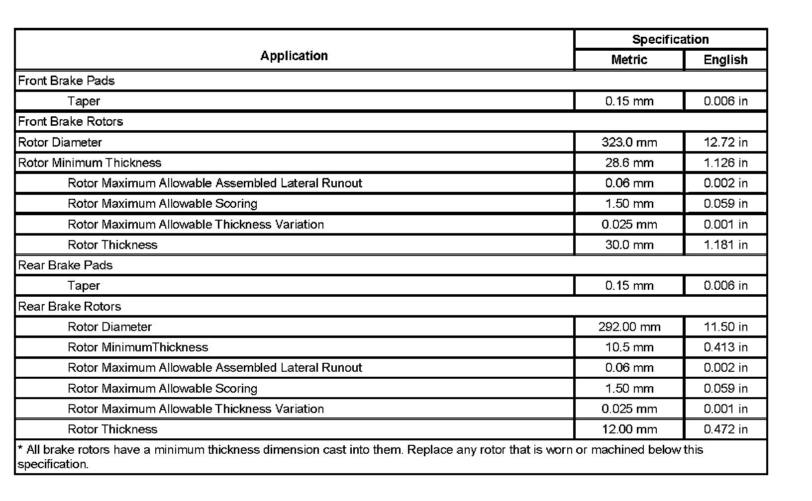 Disc Brake Component Specifications (JL9)