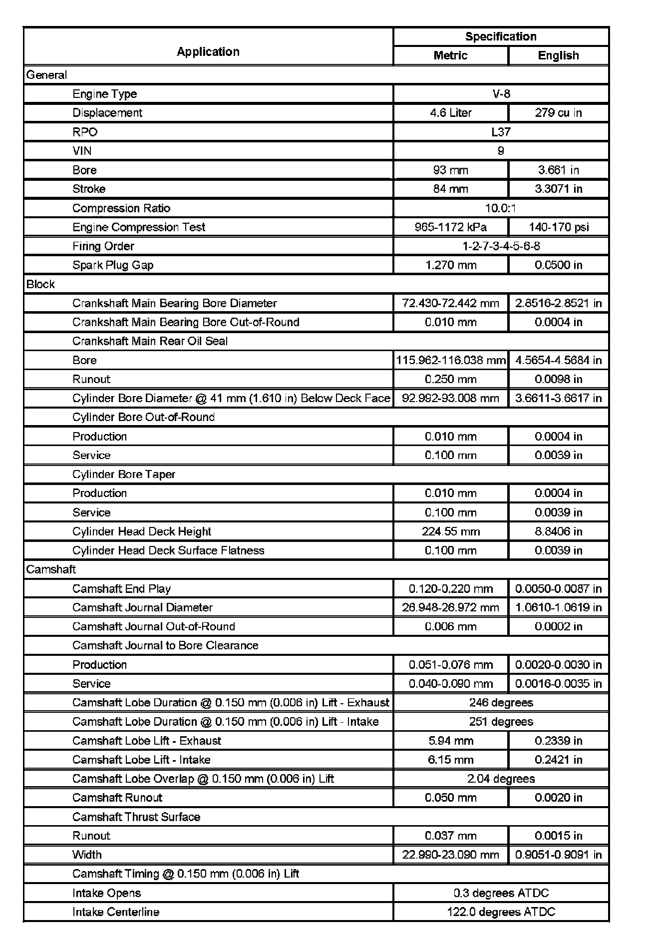 Engine Mechanical Specifications (RPO L37 VIN 9)