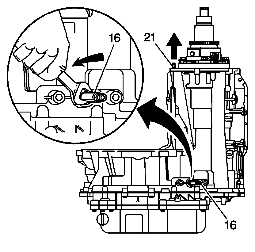 2. Rotate the manual shaft (16) counterclockwise in order to place the transaxle in Park (P) and prevent the differential from rotating.