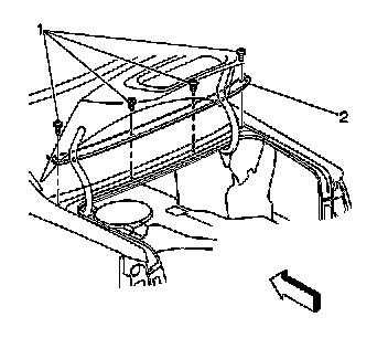 2. Remove the four fasteners (1) securing the rear window lower reveal molding (2) to the body.