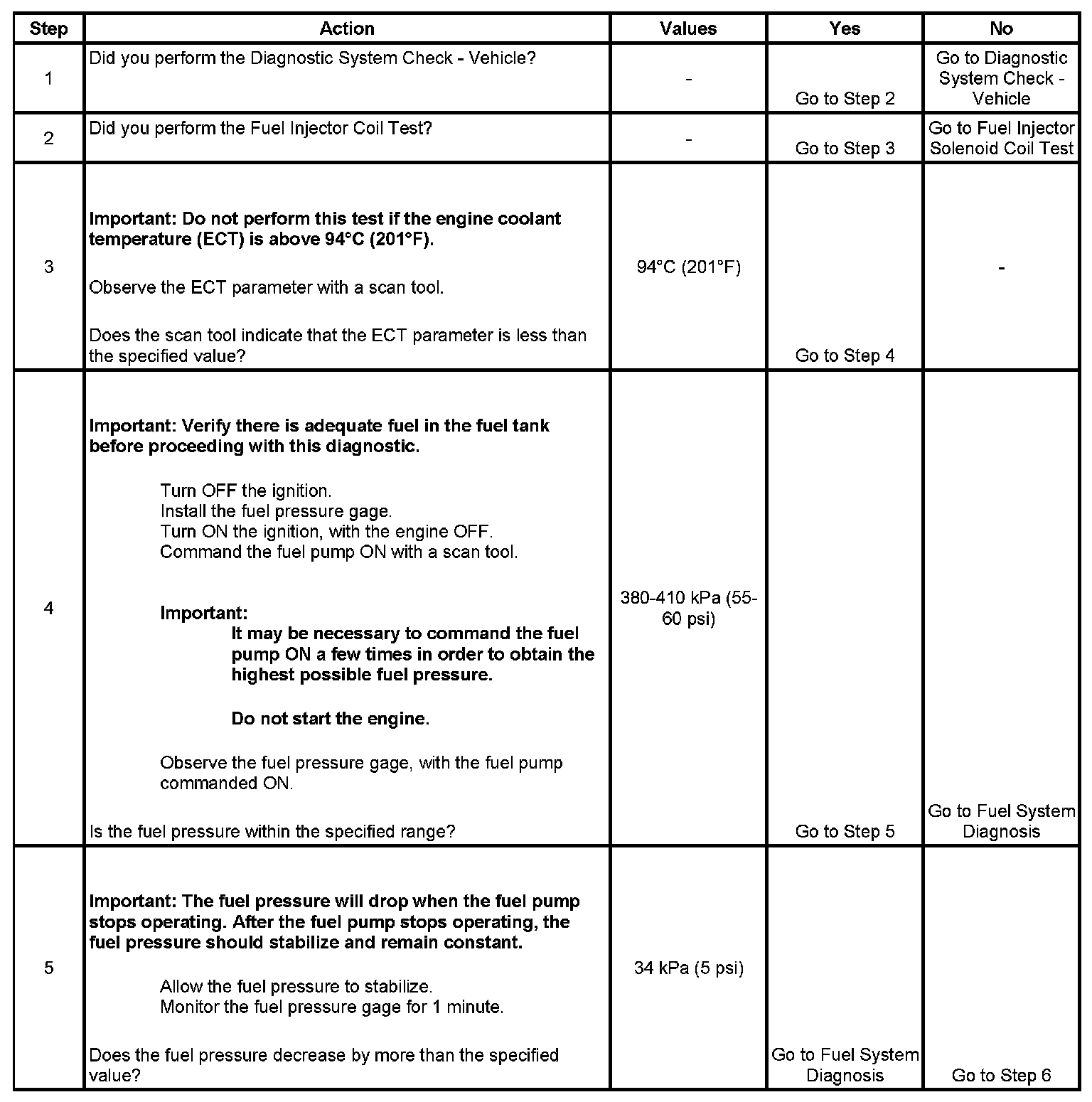 5. This step tests for an internal fuel leak. If the fuel pressure drops during this test, then an internal loss of pressure is indicated. The fuel pressure should reach a steady value.