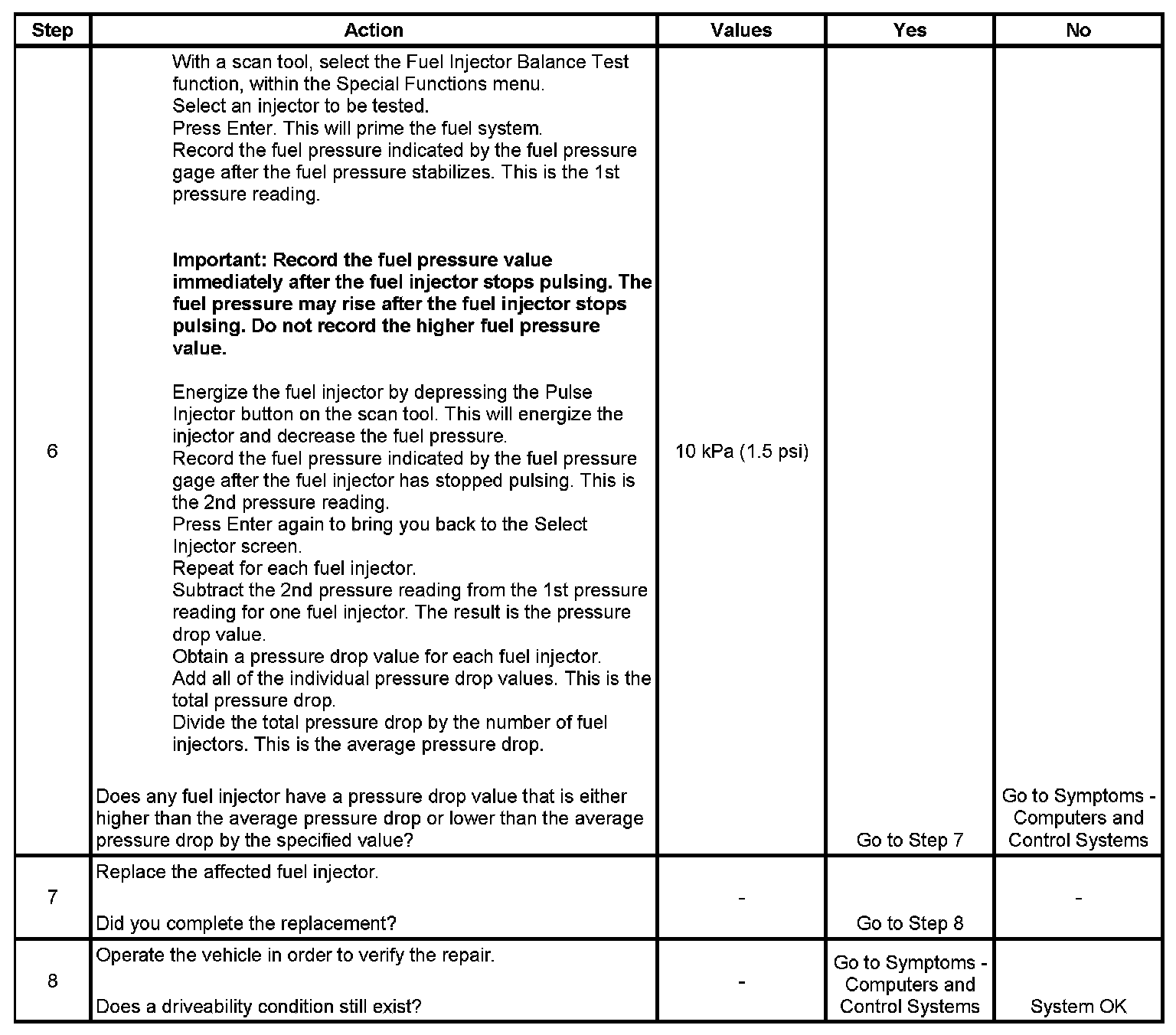 6. If the pressure drop value for each fuel injector is within 10 kPa (1.5 psi) of the average pressure drop value, the fuel injectors are flowing properly. Calculate the pressure drop value for each fuel injector by subtracting the second pressure reading from the first pressure reading.
