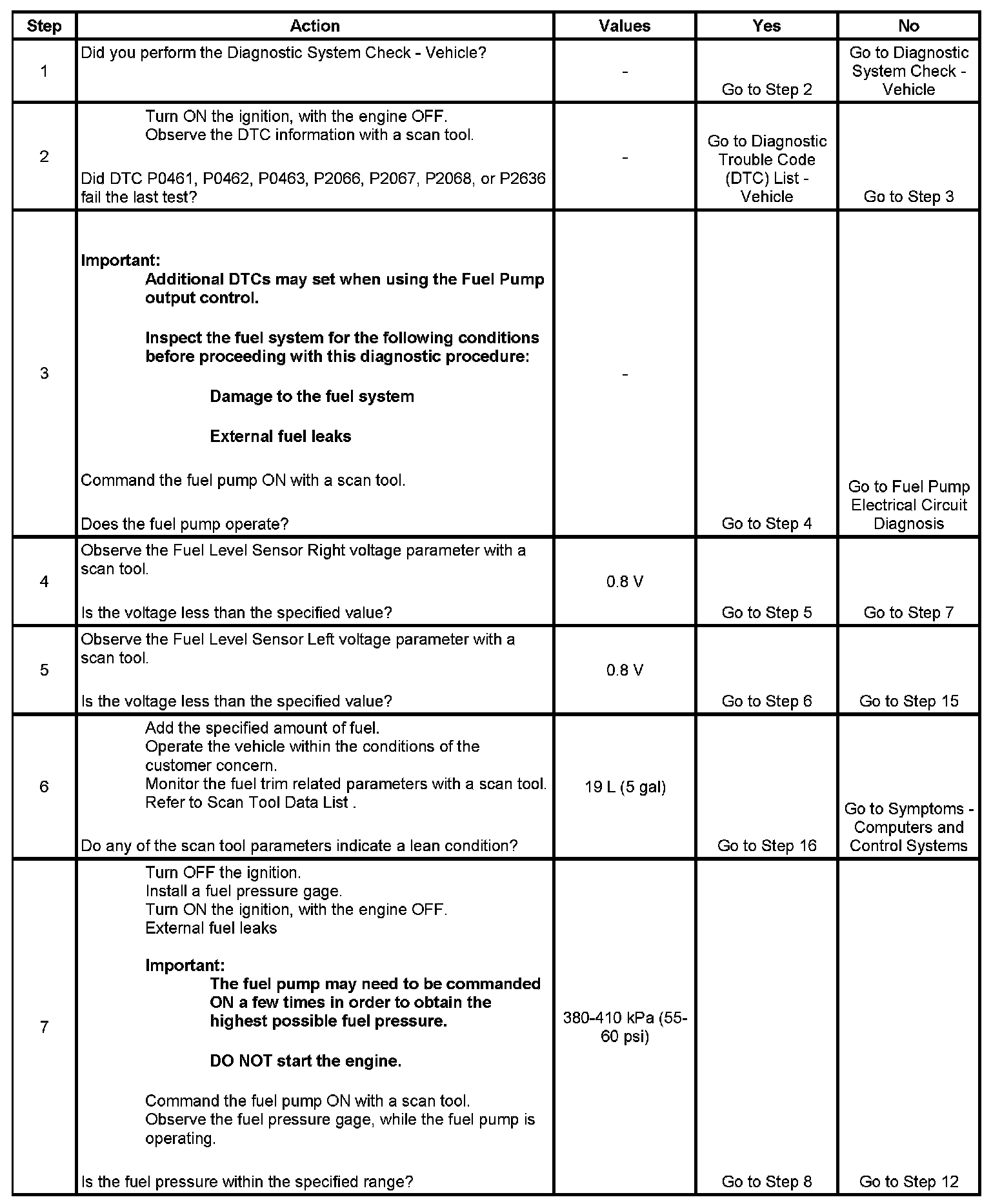 5. This step verifies that the vehicle is not out of fuel. If the right fuel sender is below 0.8 volts, and the left fuel sender is above 0.8 volt, a fuel transfer condition exists.