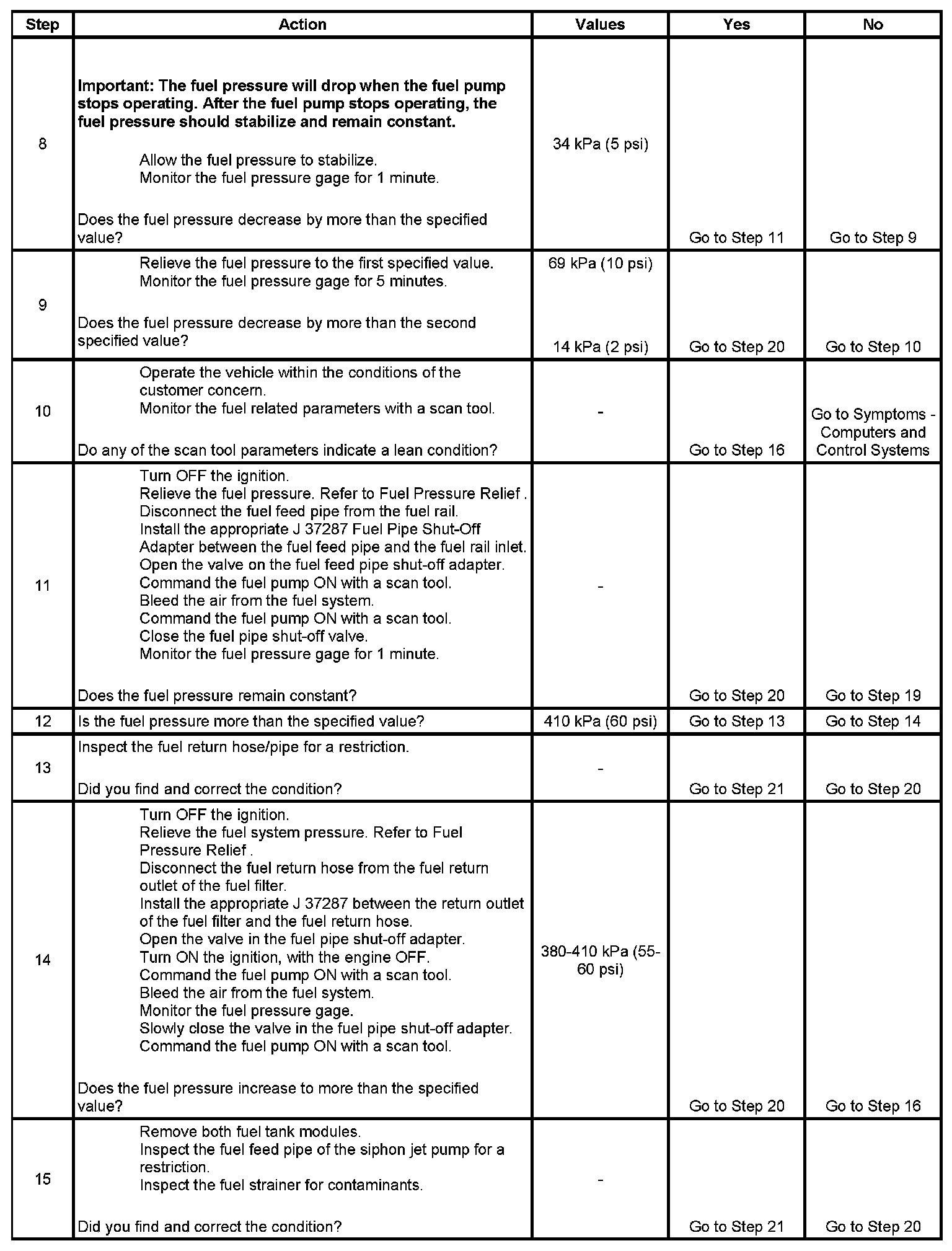 8. This step tests for an internal fuel leak. If the fuel pressure drops during this test, then an internal loss of pressure is indicated.