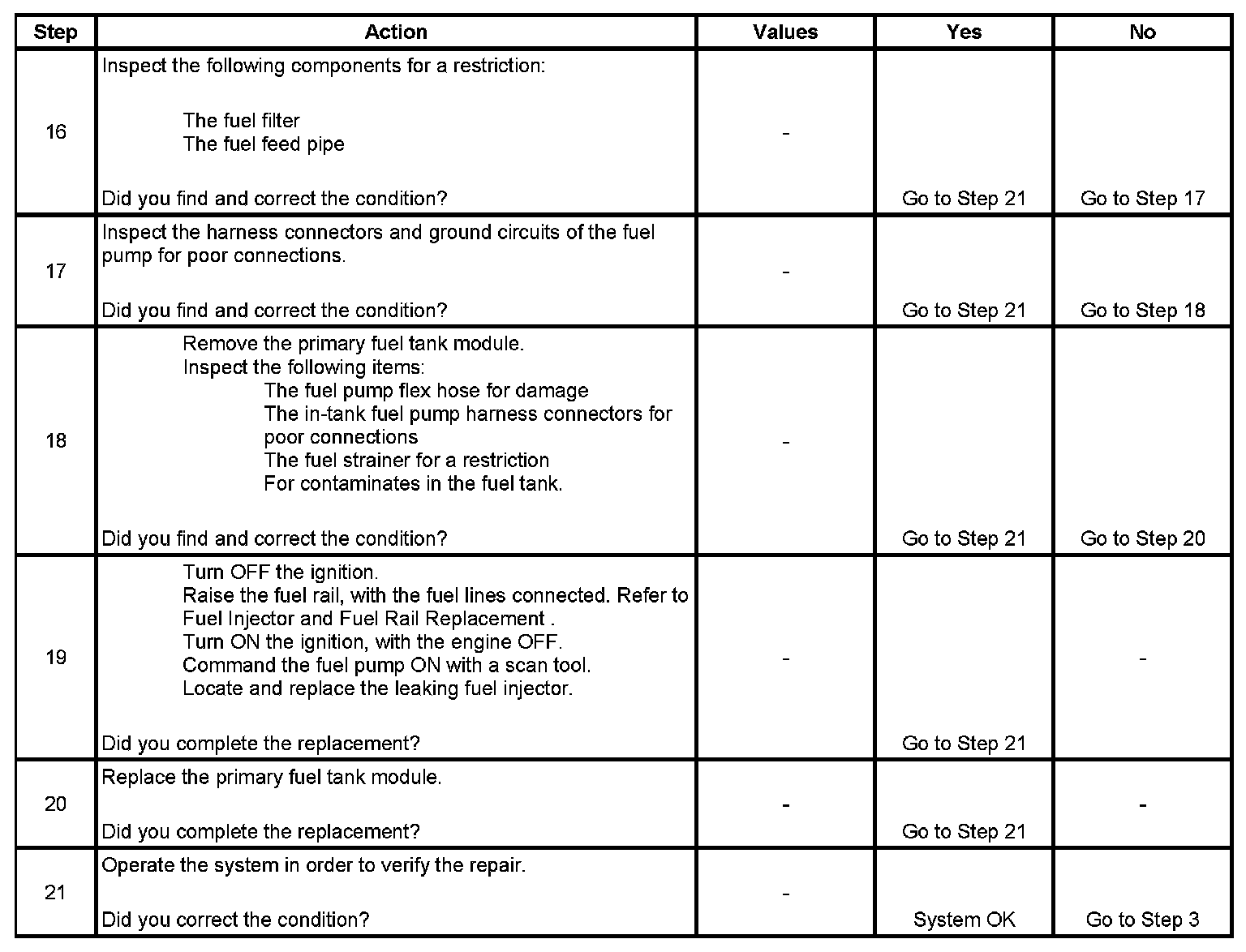 17. This step verifies that a circuit condition is not the cause of a fuel pressure concern. Inspect all fuel pump electrical circuits thoroughly.