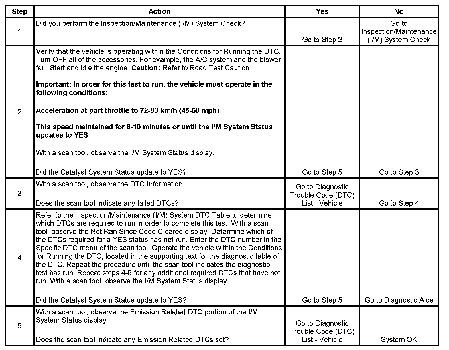 The purpose of this test is to satisfy the enable criteria necessary to execute inspection/maintenance (I/M) readiness diagnostics for the catalyst system. The test may be used to set the I/M System Status indicators to YES. Ensure the vehicle meets the requirements listed in Conditions for Running before performing this test. Failure to meet the necessary requirements may produce inaccurate test results.