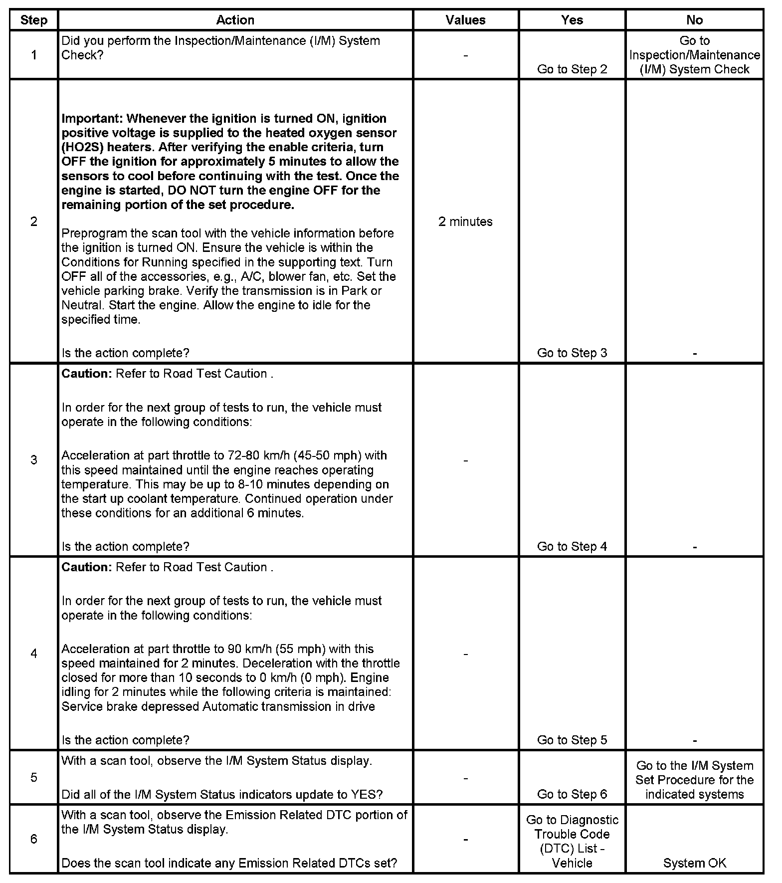 The scan tool can be used to monitor each of the I/M System Status indicators during the I/M Complete System Set Procedure. When all of the indicators for a test step have updated to YES, testing can move on to the next step even if the remaining portion of the test is not complete. For example, step 3 is designed to run the catalyst and HO2S tests. The procedure instructs the technician to operate the vehicle in the enable conditions for 8-10 minutes. If both tests have updated to YES within 4 minutes, it is not necessary to continue with the enable conditions and testing can advance to the next step.