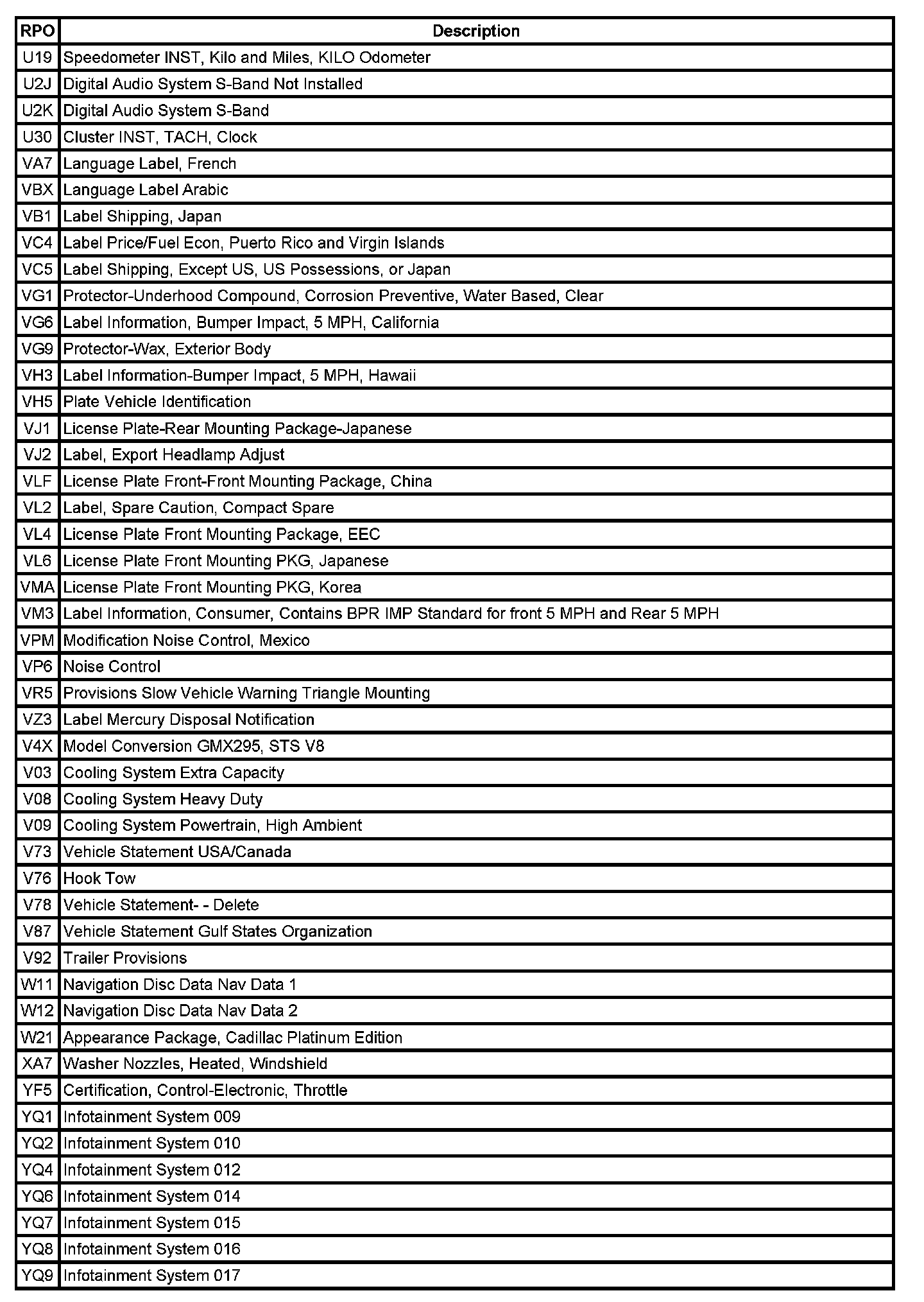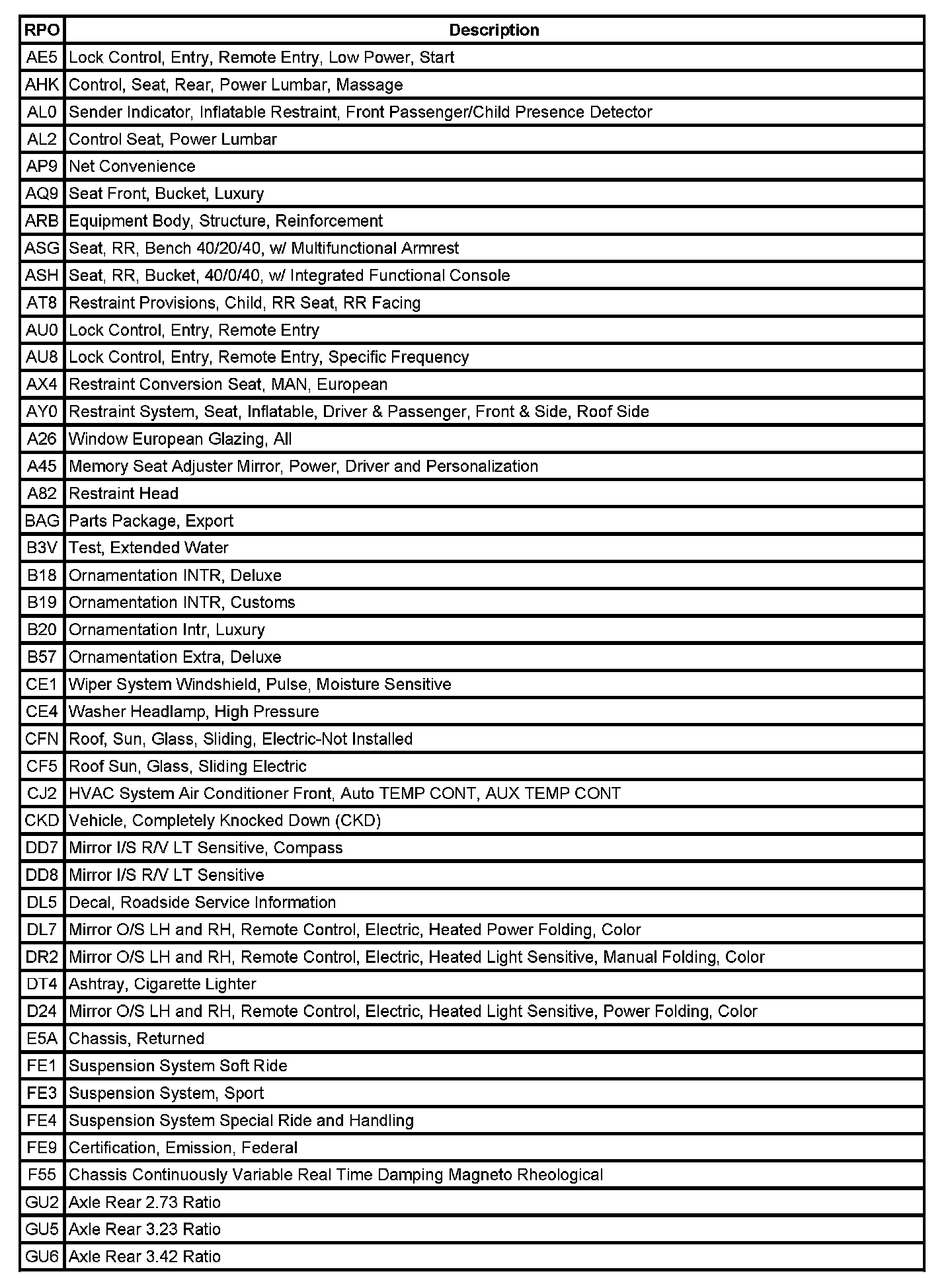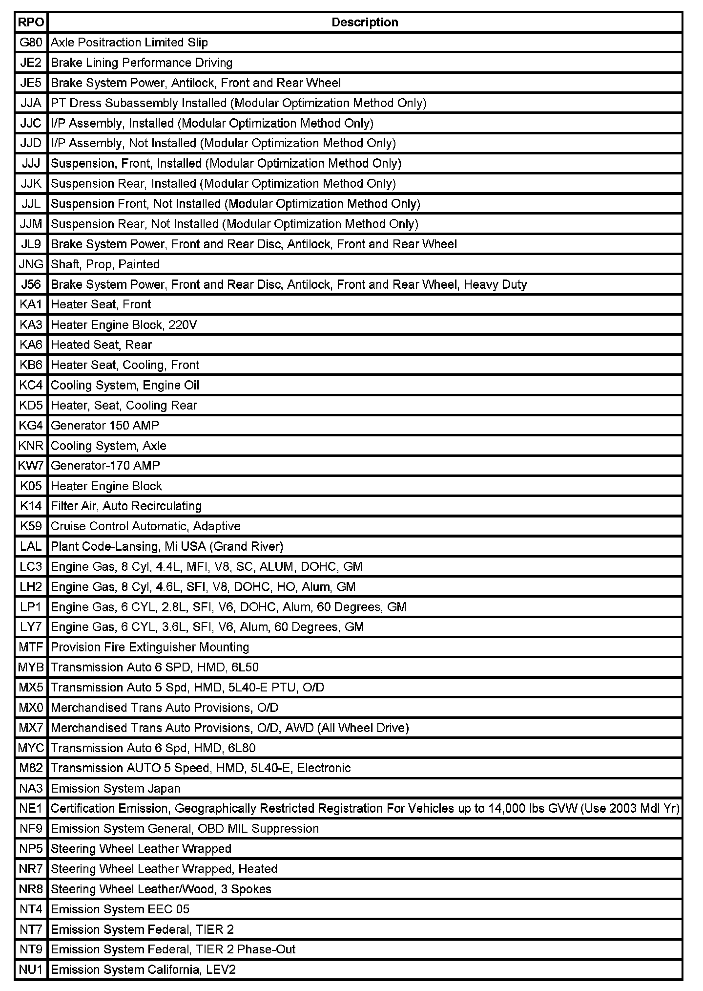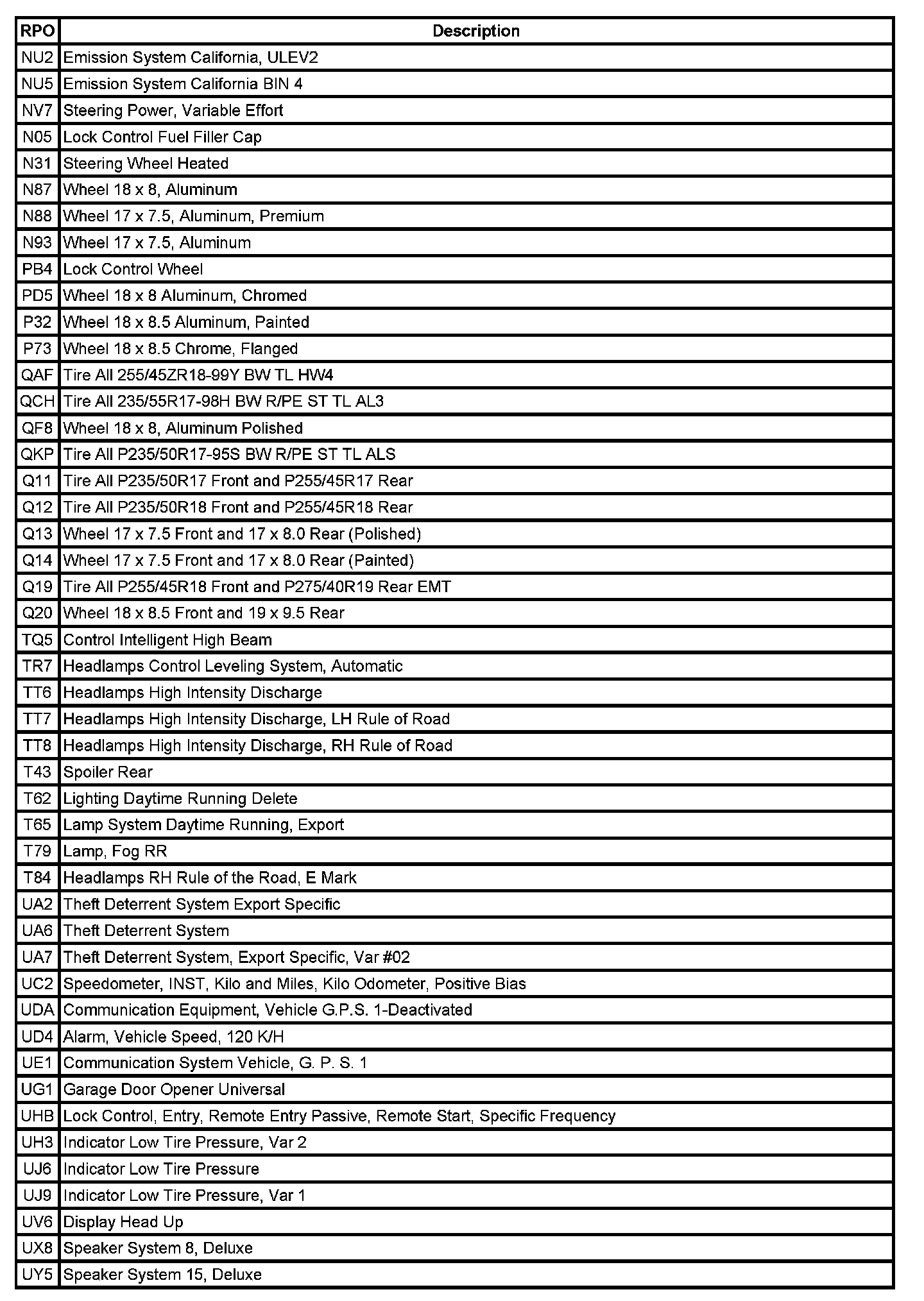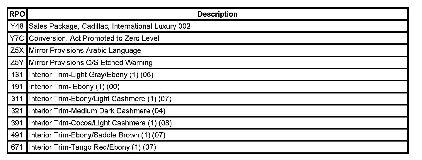 The following table provides the description of the Regular Production Option (RPO) codes that are available on the vehicle. The vehicle's RPO list is printed on the Service Parts Identification Label.