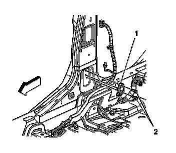 4. Remove the connector position assurance (CPA) (1) from the harness connector (2) to the inflatable restraint side impact sensor (SIS).