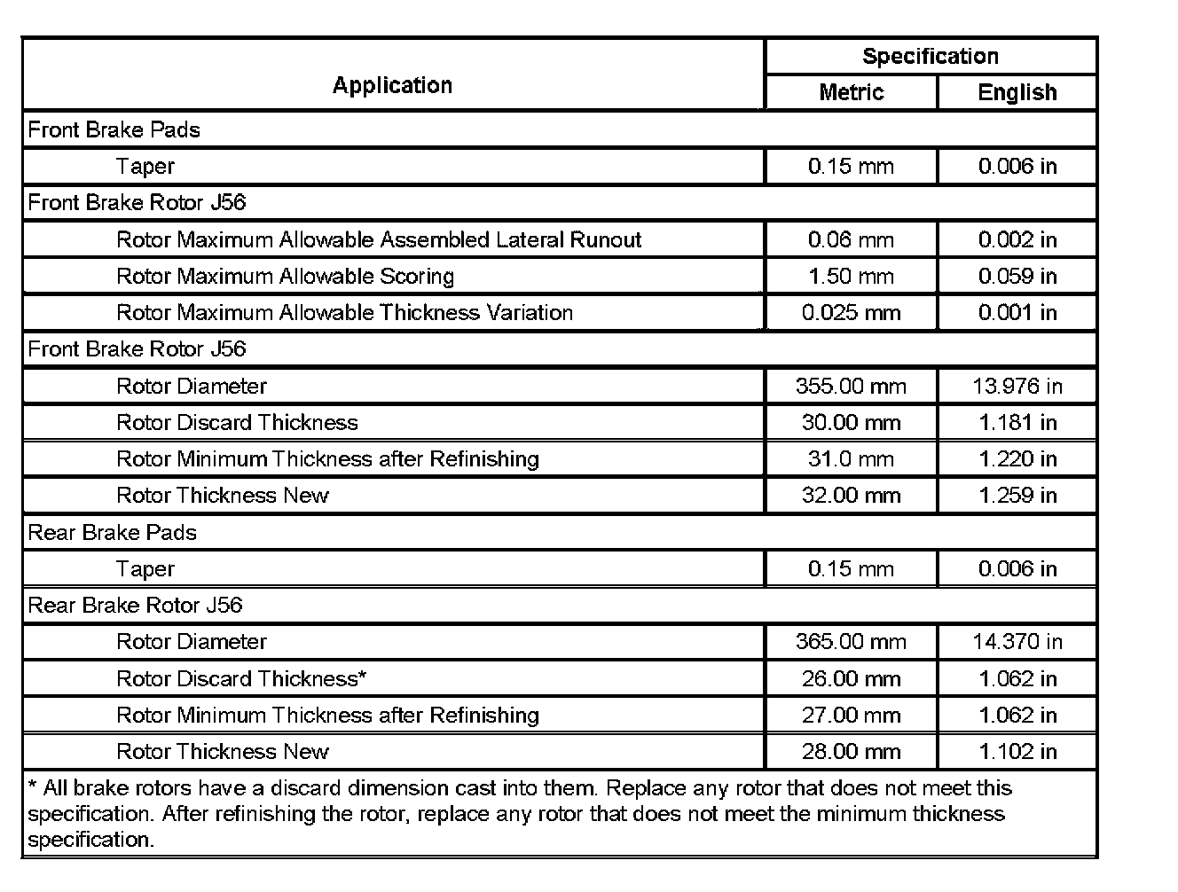 Disc Brake Component Specifications (J56)