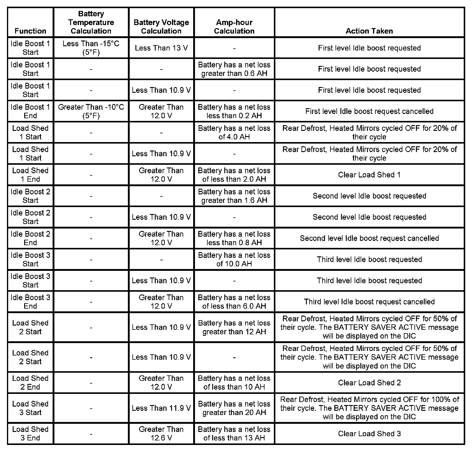 Each EPM function, either idle boost or load-shed, is discrete. No 2 functions are active at the same time. Idle boost is activated in incremental steps, idle boost 1 must be active before idle boost 2 can be active. The IPM will enter a load shed event when there is DTC P1668, P2500, P2501 or when any of the following conditions are met: