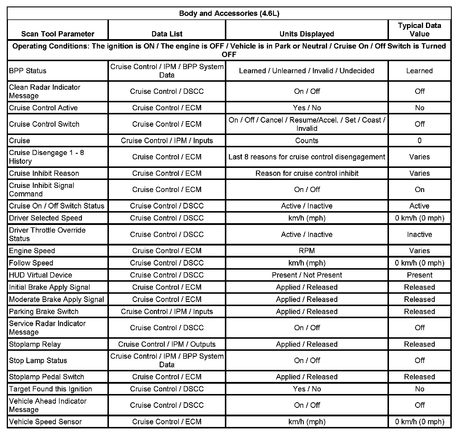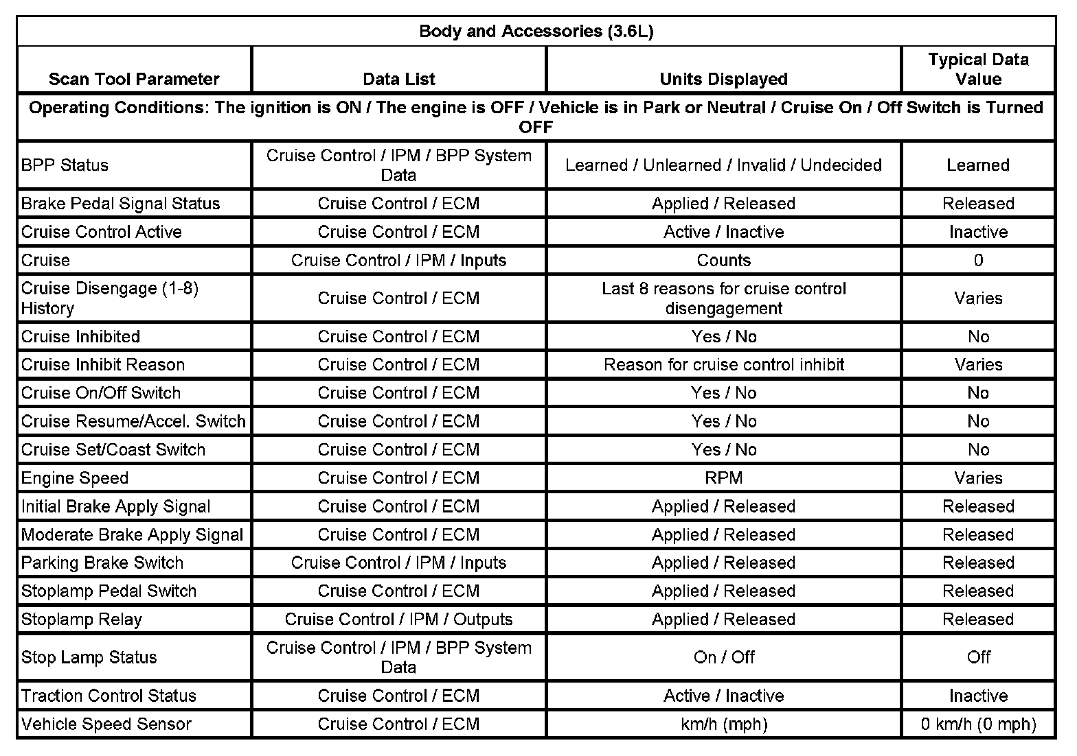 The scan tool data lists contain all of the cruise control related parameters that are available on the scan tool for the Cruise Control System. The parameters in the list are arranged in alphabetical order. The data list column indicates the location of the parameter within the scan tool menu selections.