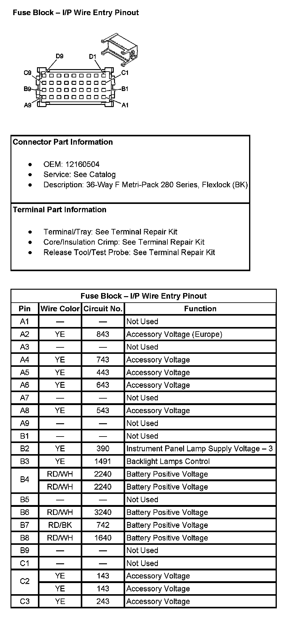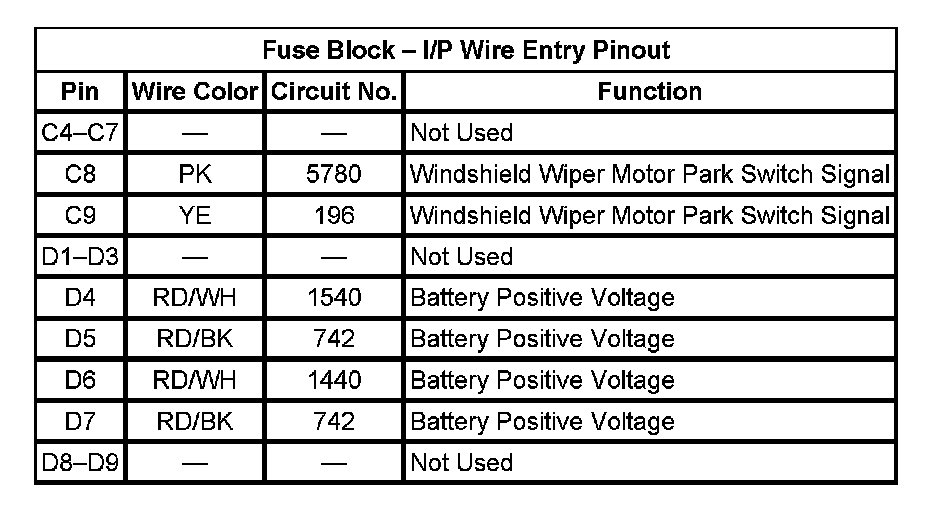 Fuse Block - I/P Wire Entry Pinout (Pin C4 To D9):