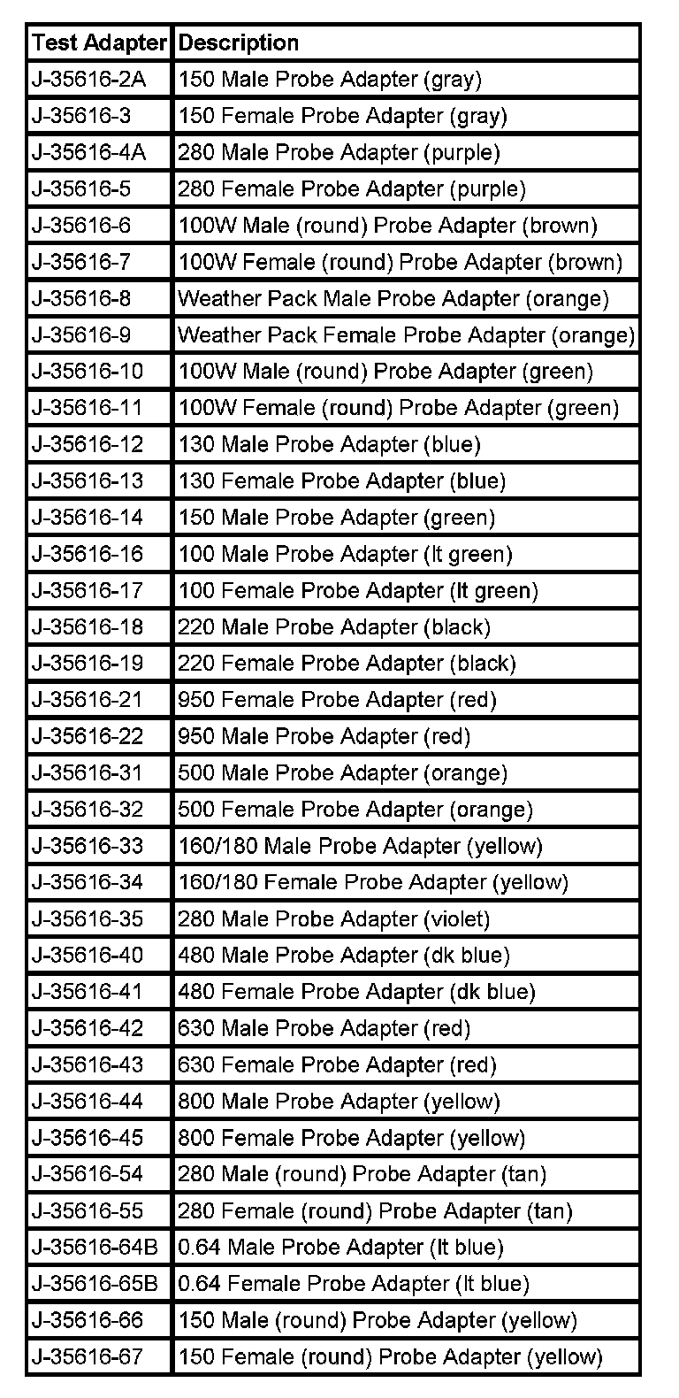 Refer to the table as a guide in selecting the correct test adapter for frontprobing connectors.