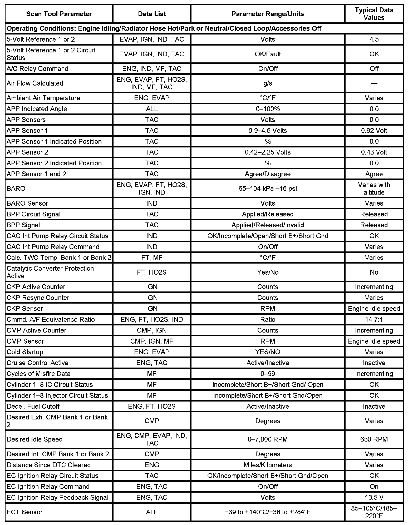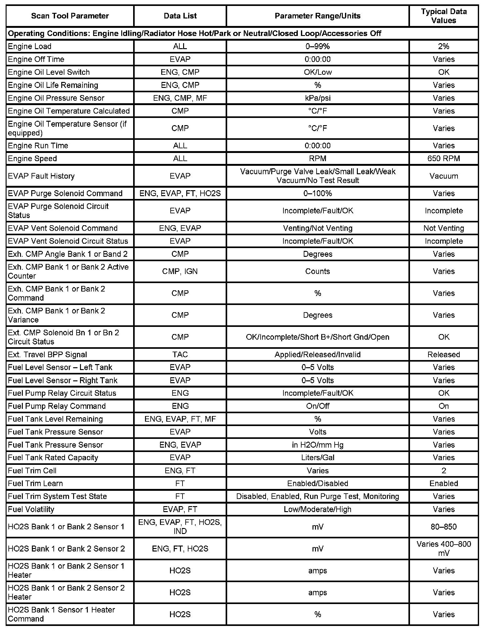 The Engine Scan Tool Data List contains all engine related parameters that are available on the scan tool. The list is arranged in alphabetical order. A parameter may appear in any one of the data lists, and in some cases may appear more than once, or in more than one data list in order to group certain related parameters together.