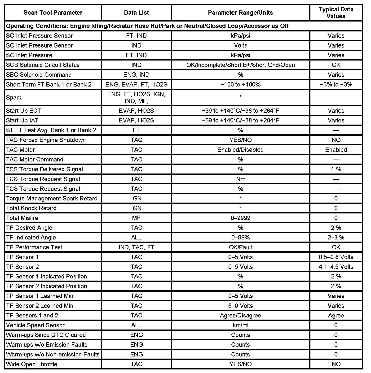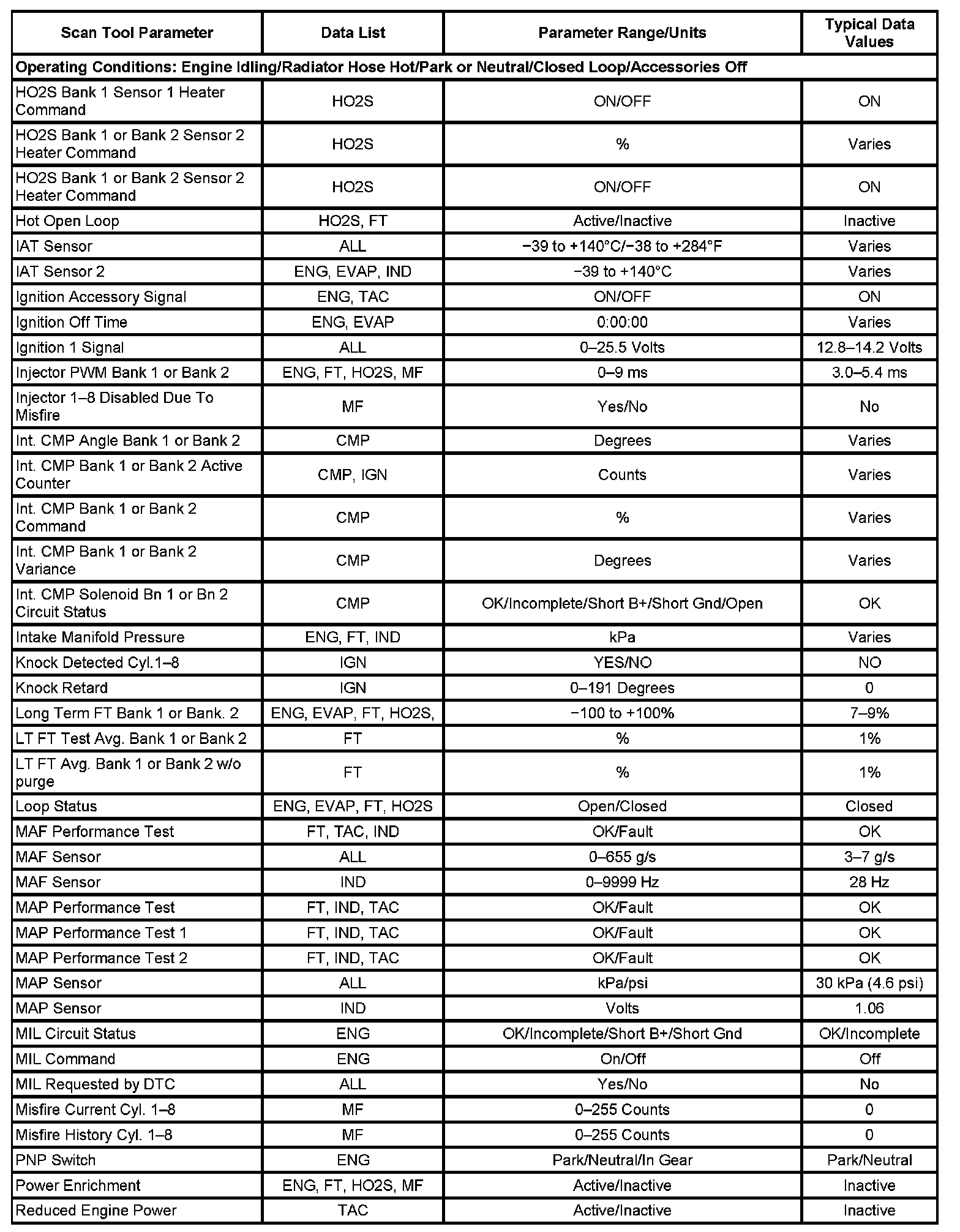Scan tool values from a properly running engine may be used for comparison with the engine you are diagnosing. The Engine Scan Tool Data List represents the values that would be seen on a normal running engine.