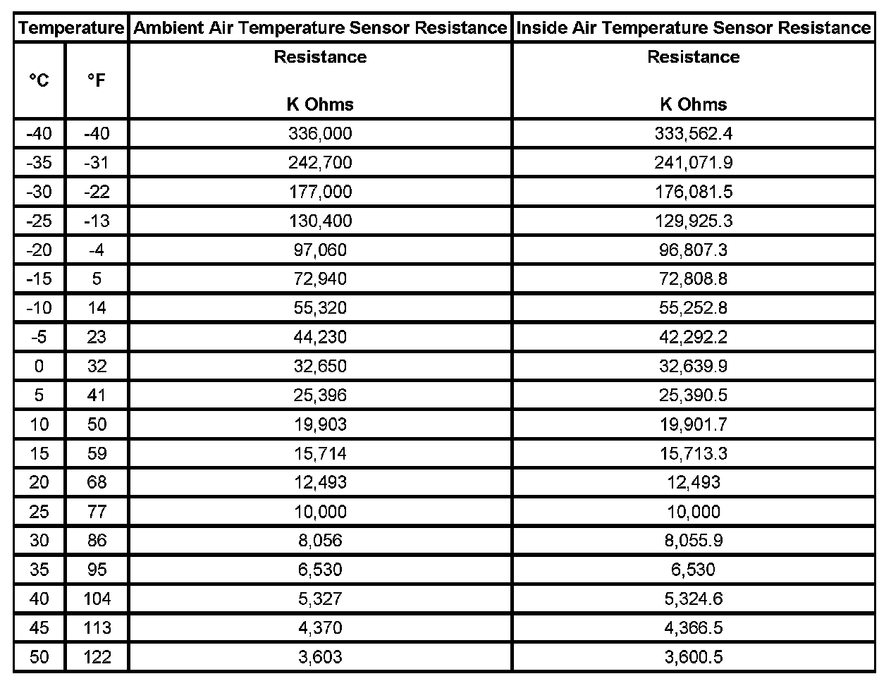 Sensor Resistance Table (Inside and Ambient Air Temp Sensor)