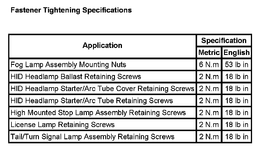 Fastener Tightening Specifications: