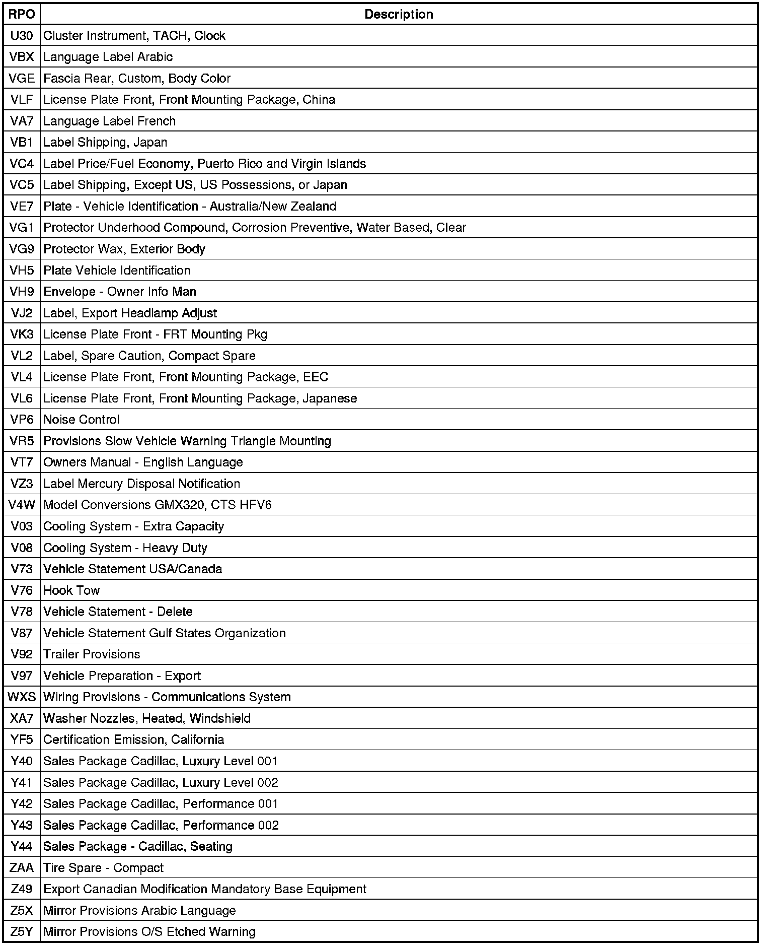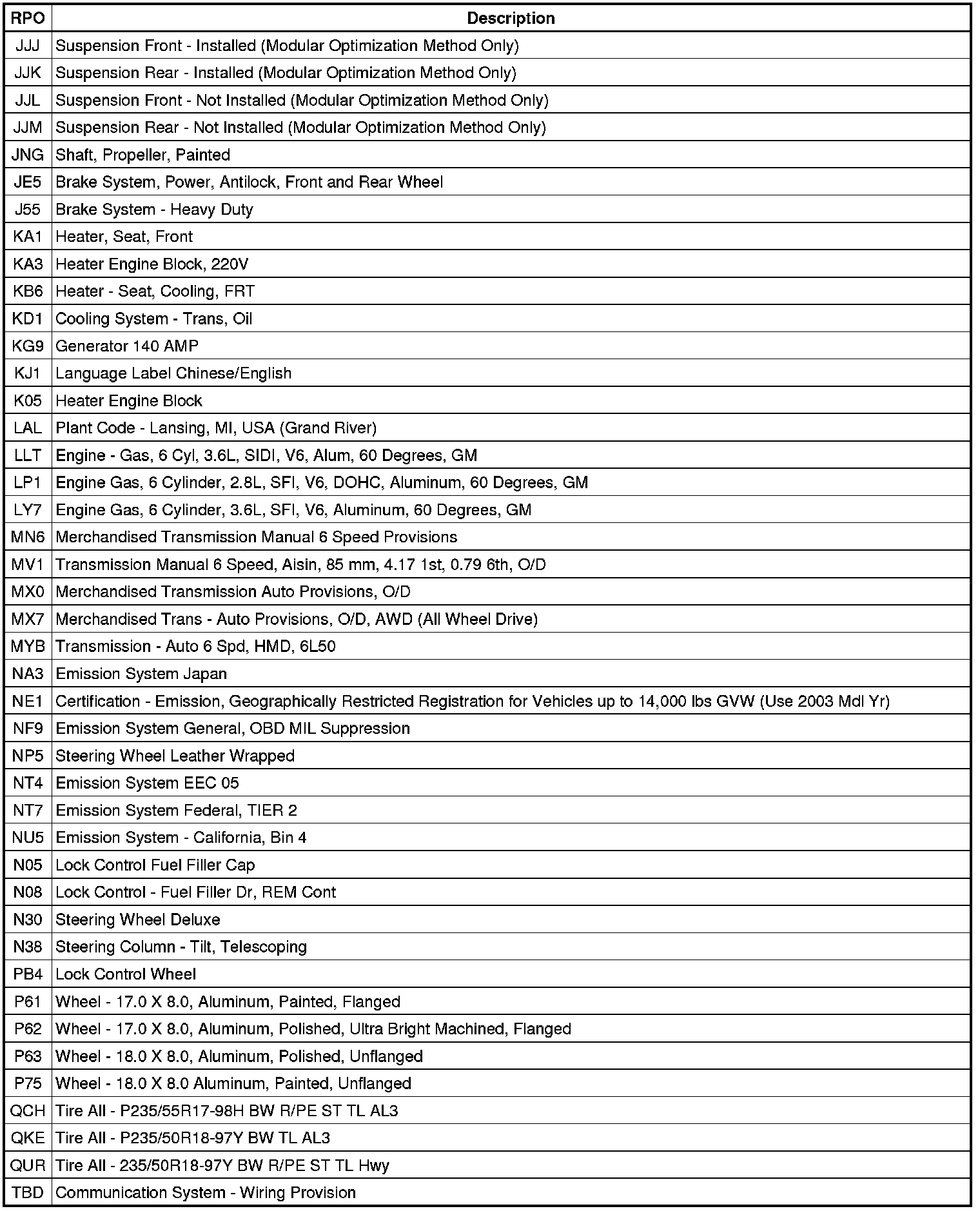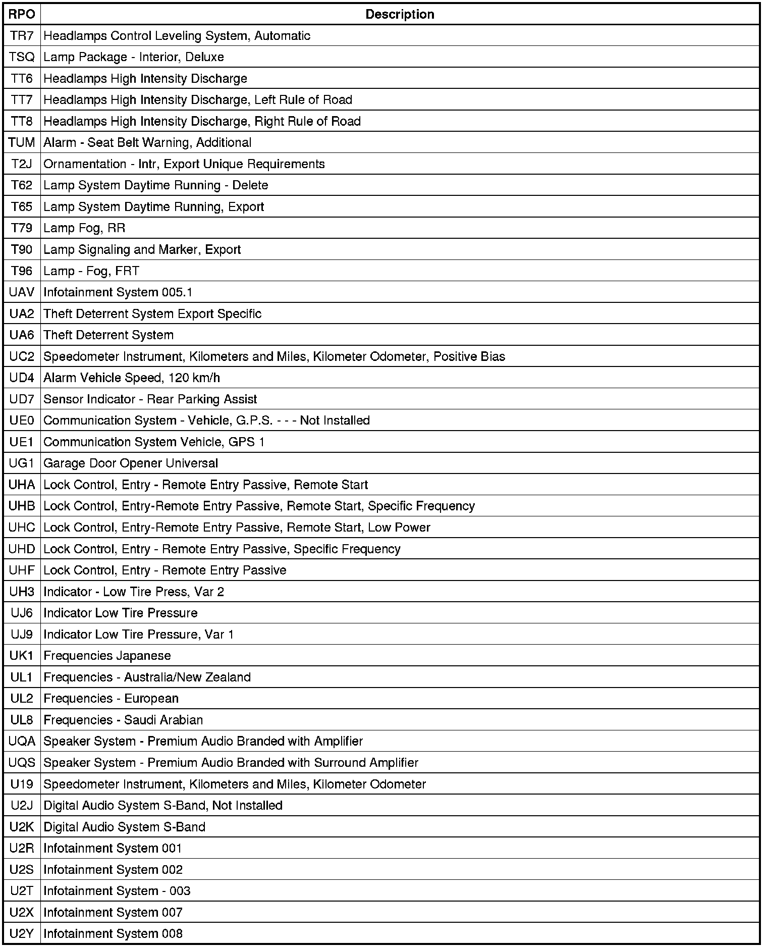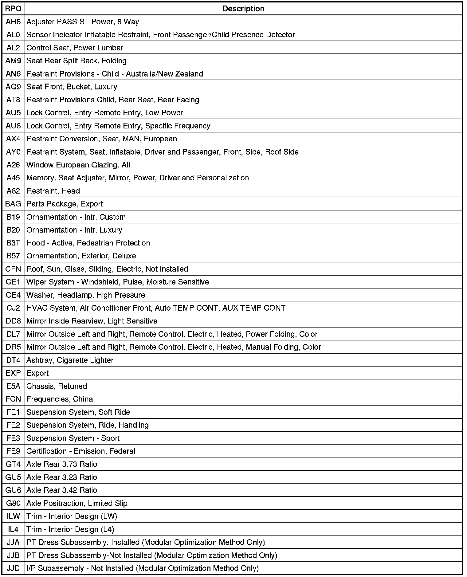 The following table provides the description of the regular production option (RPO) codes that are available on the vehicle. The vehicle's RPO list is printed on the Service Parts Identification Label.