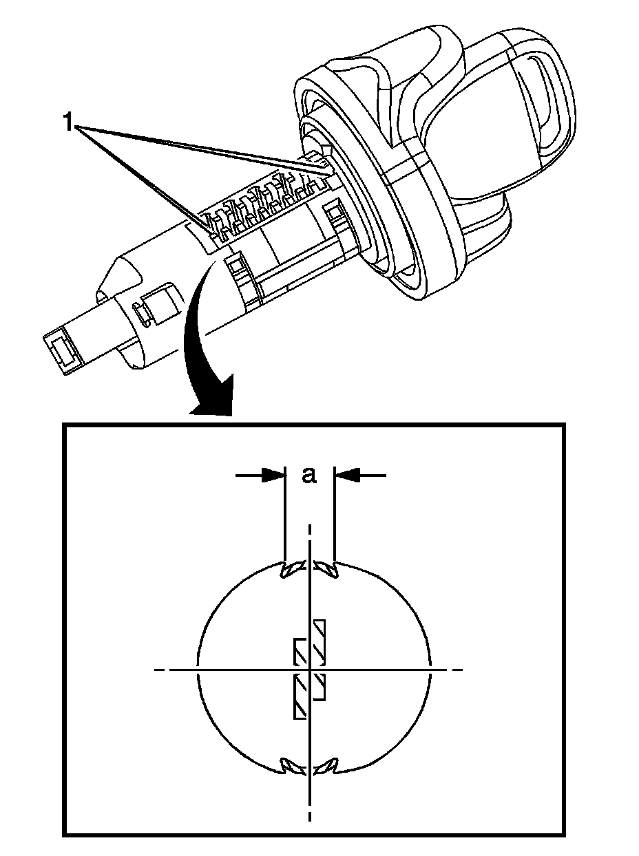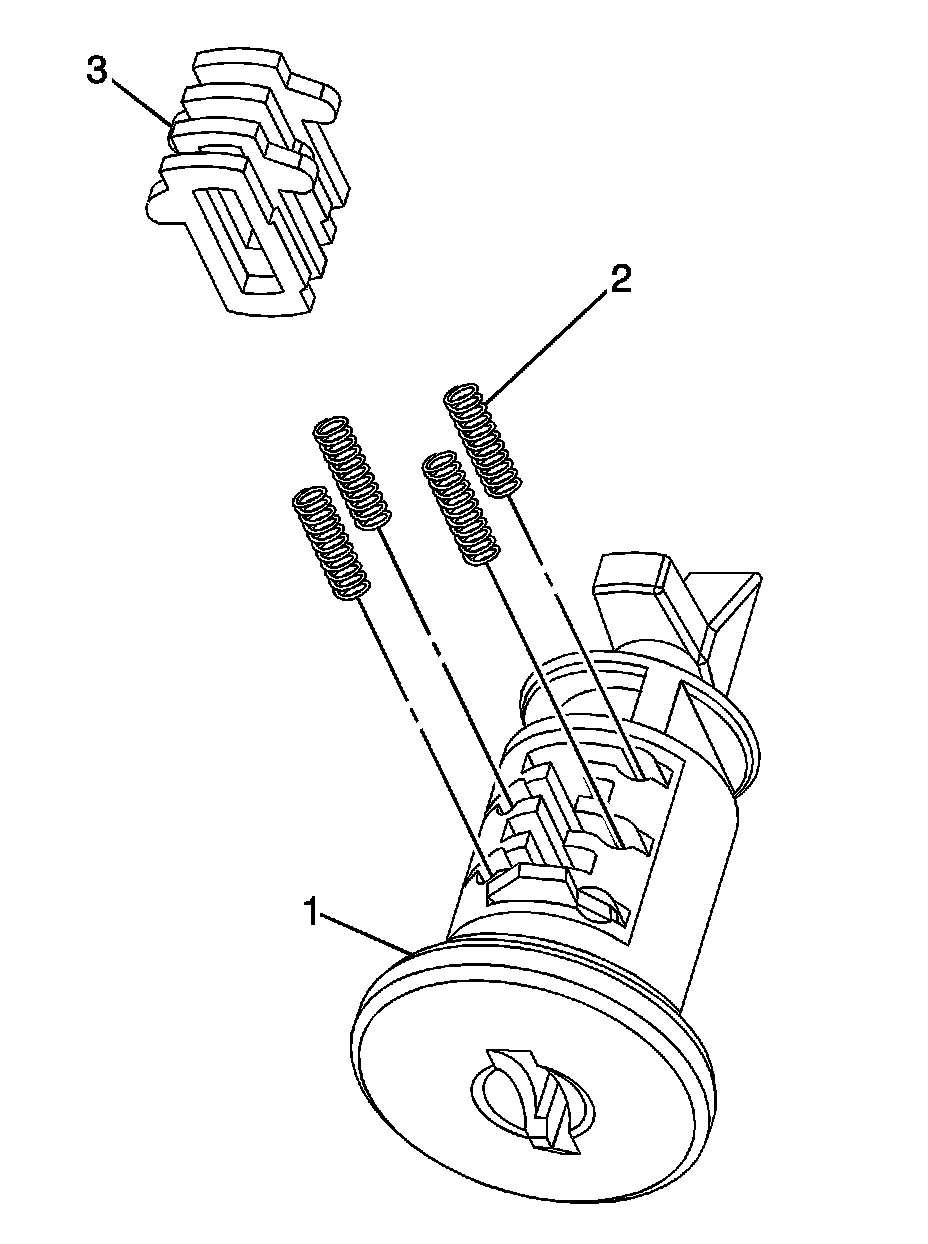 The instrument panel (I/P) compartment door lock cylinder uses 4 of the 10 key cut positions, 7-10 when counting from the key head. The tumbler orientations alternate in adjacent locations with all 4 tumblers (3) located on the same side. A stainless steel retaining tumbler is used in the I/P compartment door lock cylinder to retain the lock cylinder in the latch assembly and does not move when the key is inserted. The retaining tumbler is located in the tumbler slot closest to the head of the cylinder assembly (1) and comes pre-installed in the cylinder.