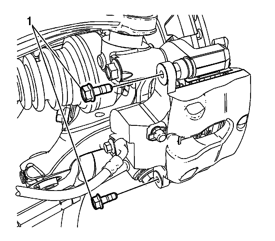 3. Using a backup wrench on the brake caliper guide pins, remove the brake caliper guide pin bolts (1).