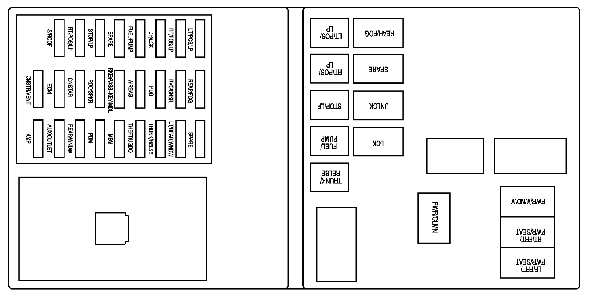 The rear compartment fuse block is located on top of the battery, on the right side of the trunk. The battery access door must be removed to access the fuse block.