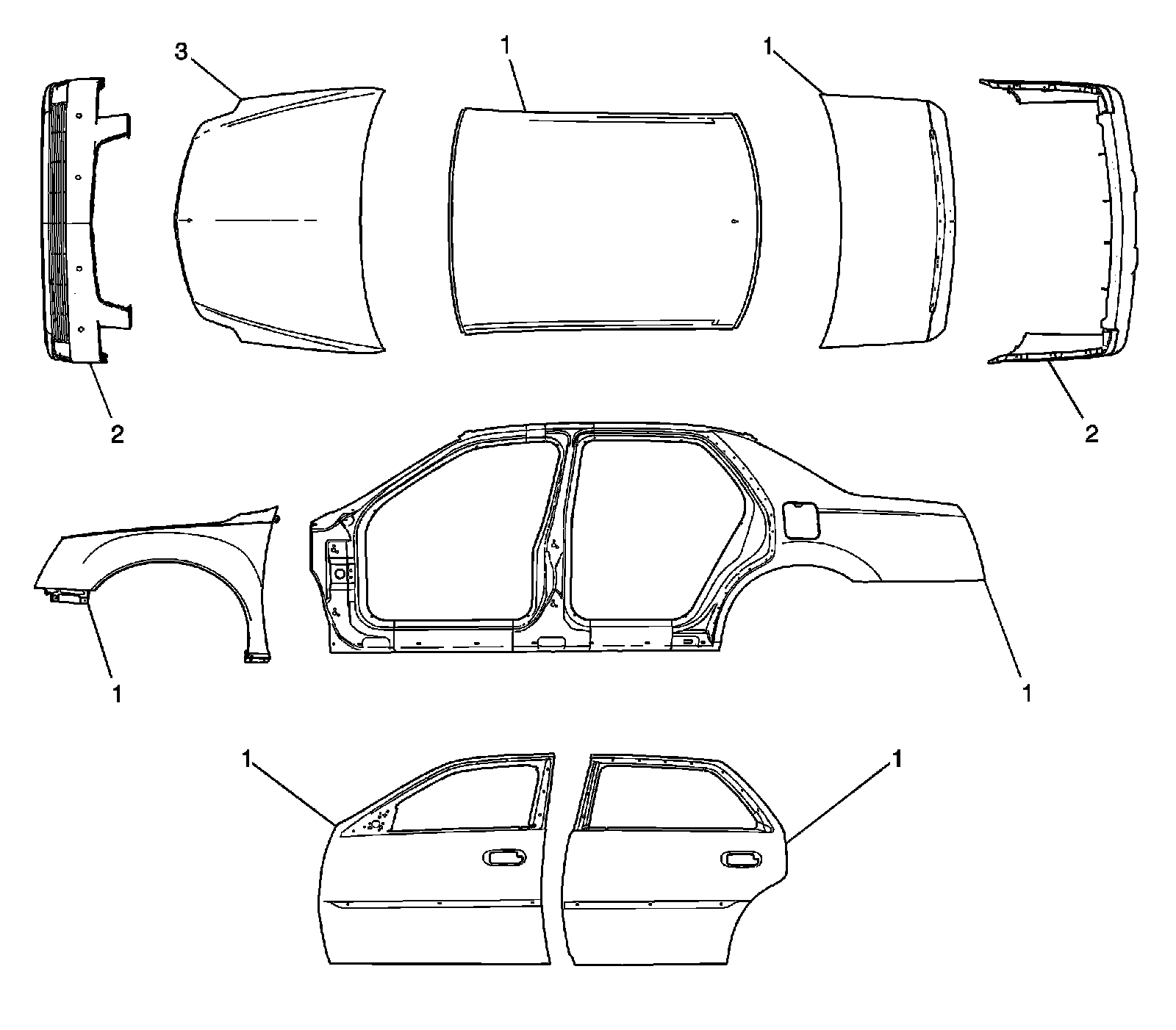 Exterior body panels are constructed of various materials. This is due to increased dent and corrosion resistance of modern composites. All vertical panels: fenders, doors, quarter and rocker panels, roof, and deck are made from rigid steel. Front and rear fascias and bumper covers are constructed of thermoplastic olefin (TPO). The hood is aluminum.