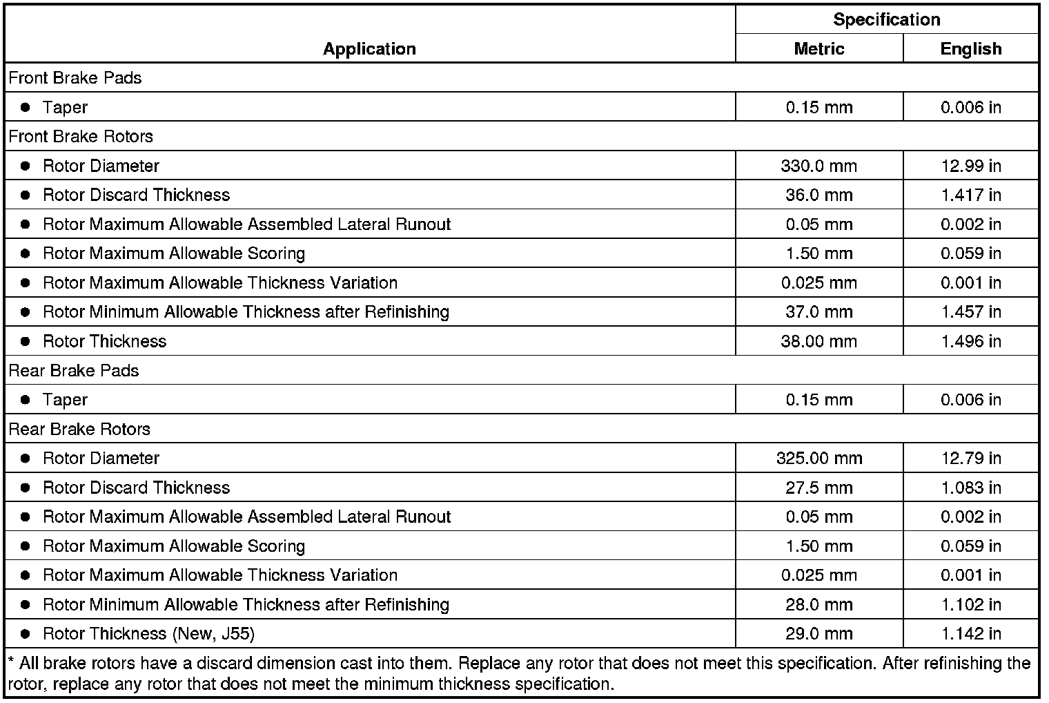 Disc Brake Component Specifications (J55)