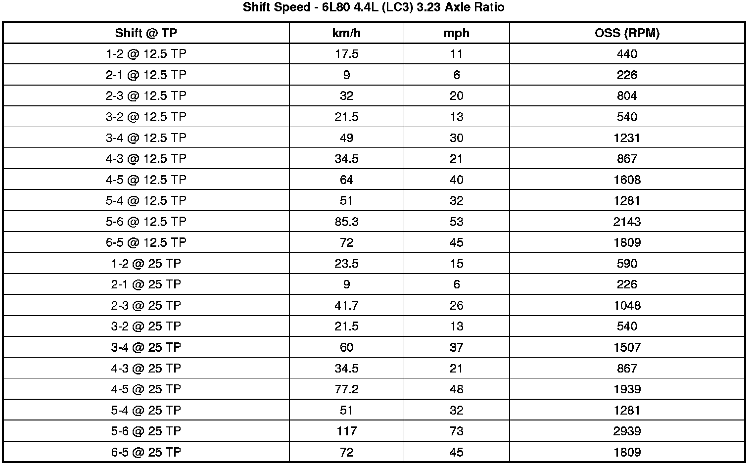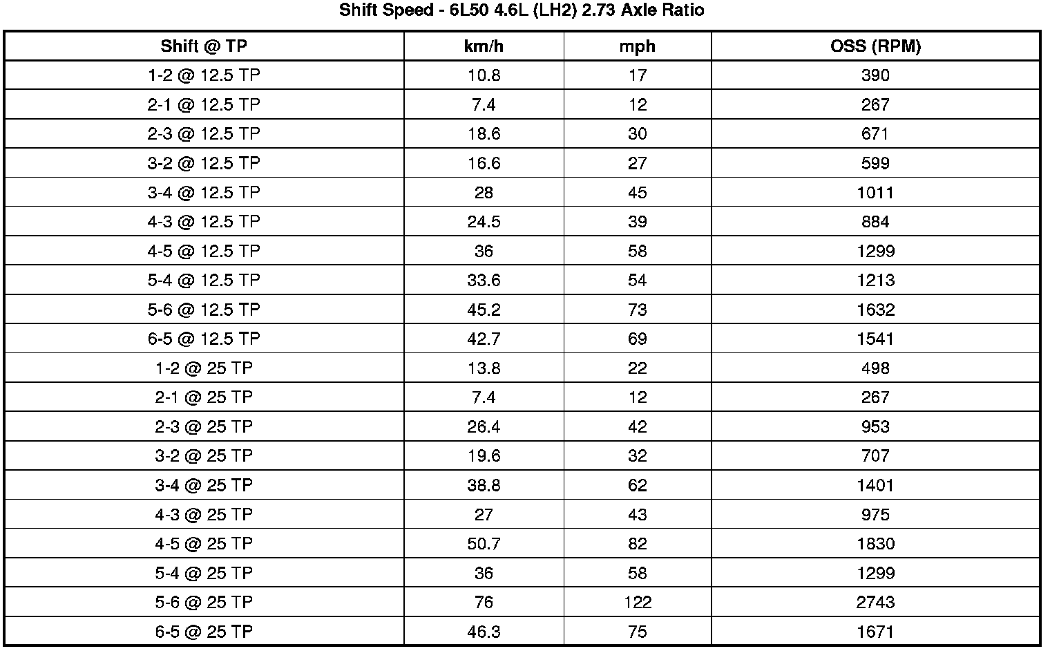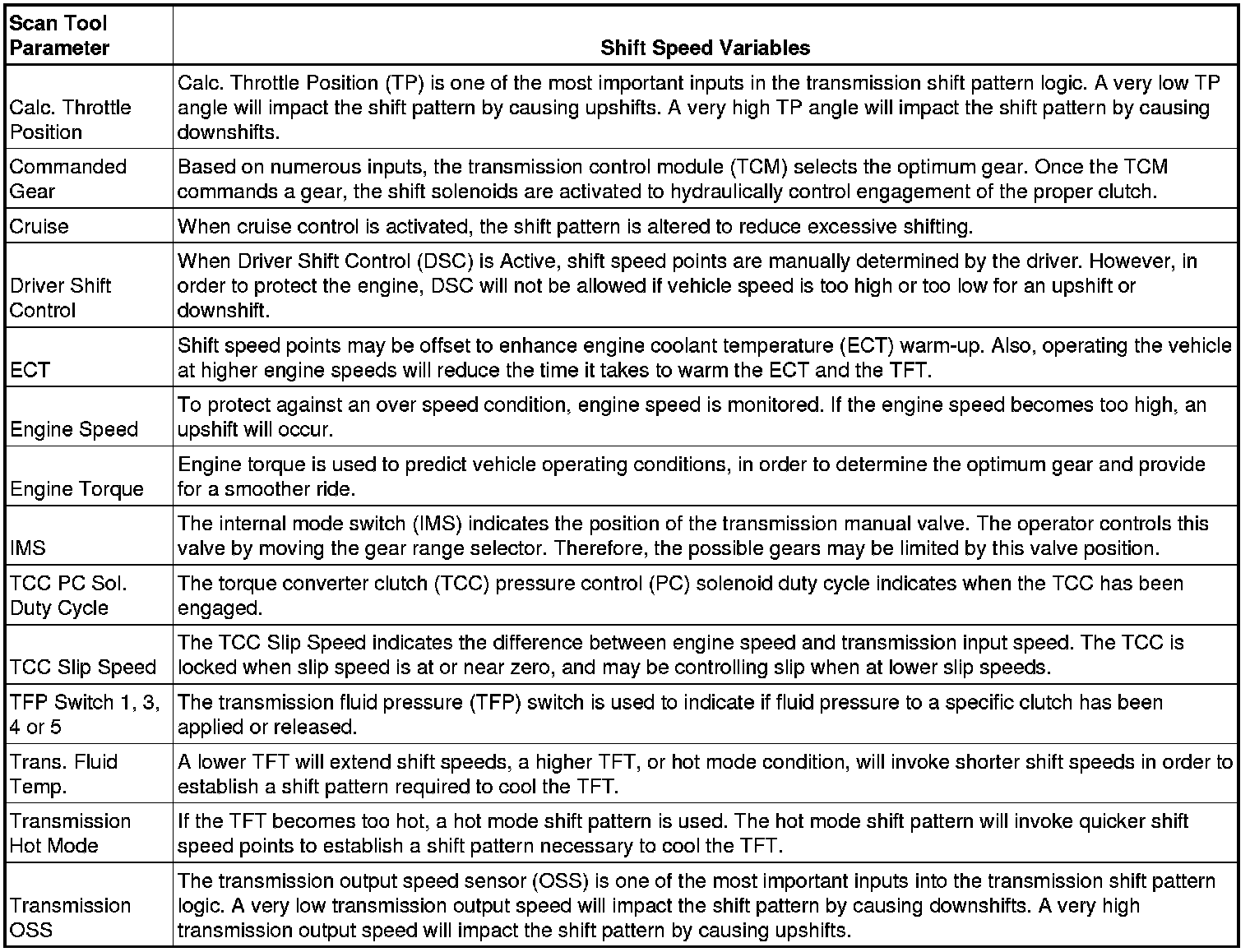 Important: Shift speed points are affected by many different vehicle and transmission operating conditions. The table above represents shift speed points calibrated at specific throttle angles during normal operating conditions and a temperature range between 0-130°C (32-266°F). These shift speed points are also based on an axle ratio of 2.73 and 3.23, and assume a production-intent tire size. The table below illustrates a number of different variables that influence these shift speed points. Based on a given operating condition, these variables may override the normal shift speed points. To assist in monitoring the different variables, the respective scan tool data parameter is also listed.