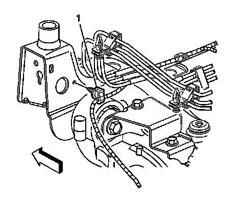 9. Loosen the brake line bracket nut (1).