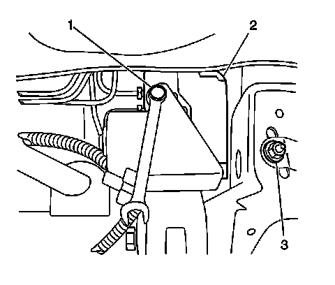 12. Remove the washer bottle bracket nuts and bracket (3).
