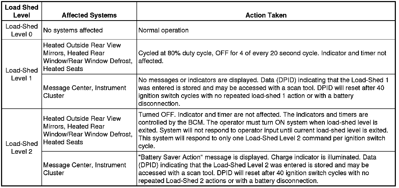 The BCM will either request an increase in the engine idle speed from the ECM or the BCM will turn off loads, called the load-shed function, in order to preserve the vehicle electrical system operation. The criteria used by the BCM to regulate this electrical load management are outlined below: