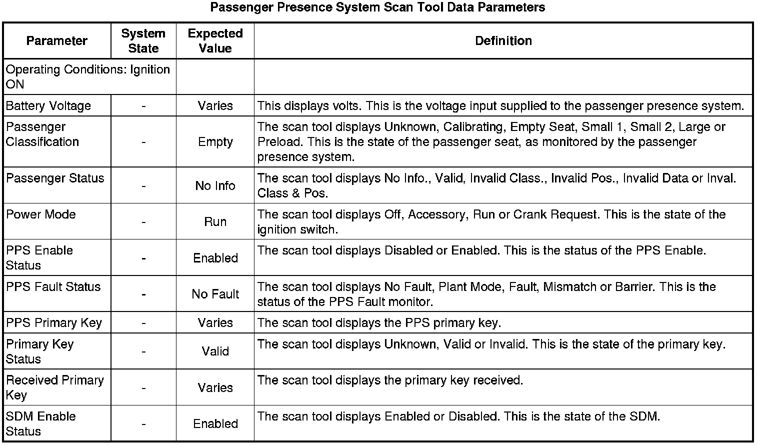 Inflatable Restraint Passenger Presence System Scan Tool Information