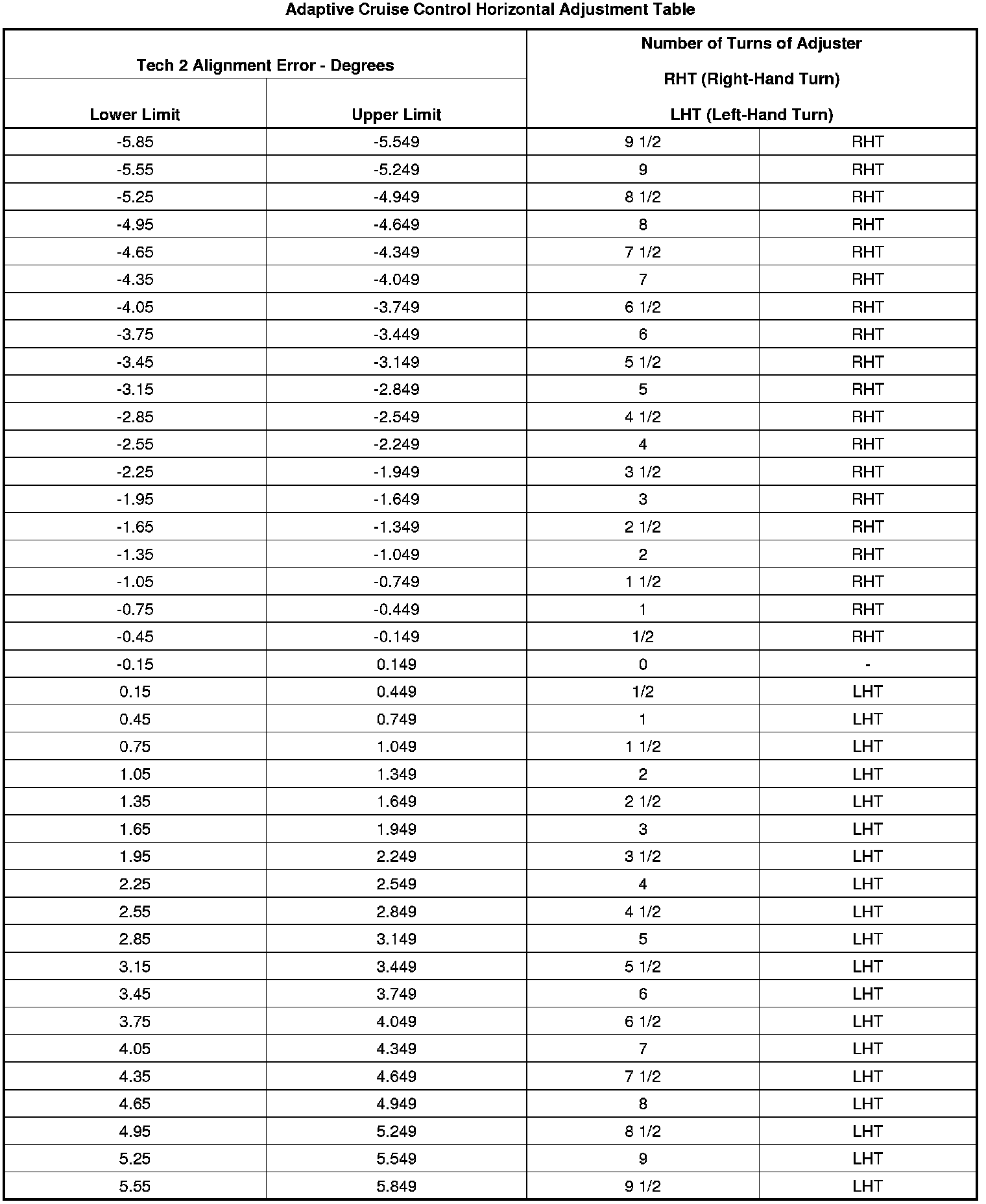 4. Use a Tech 2 and the Adaptive Cruise Control Horizontal Adjustment Table. Using the Tech 2 Alignment Error, adjust the horizontal until the alignment error is between -2.5 and +2.5 degrees.