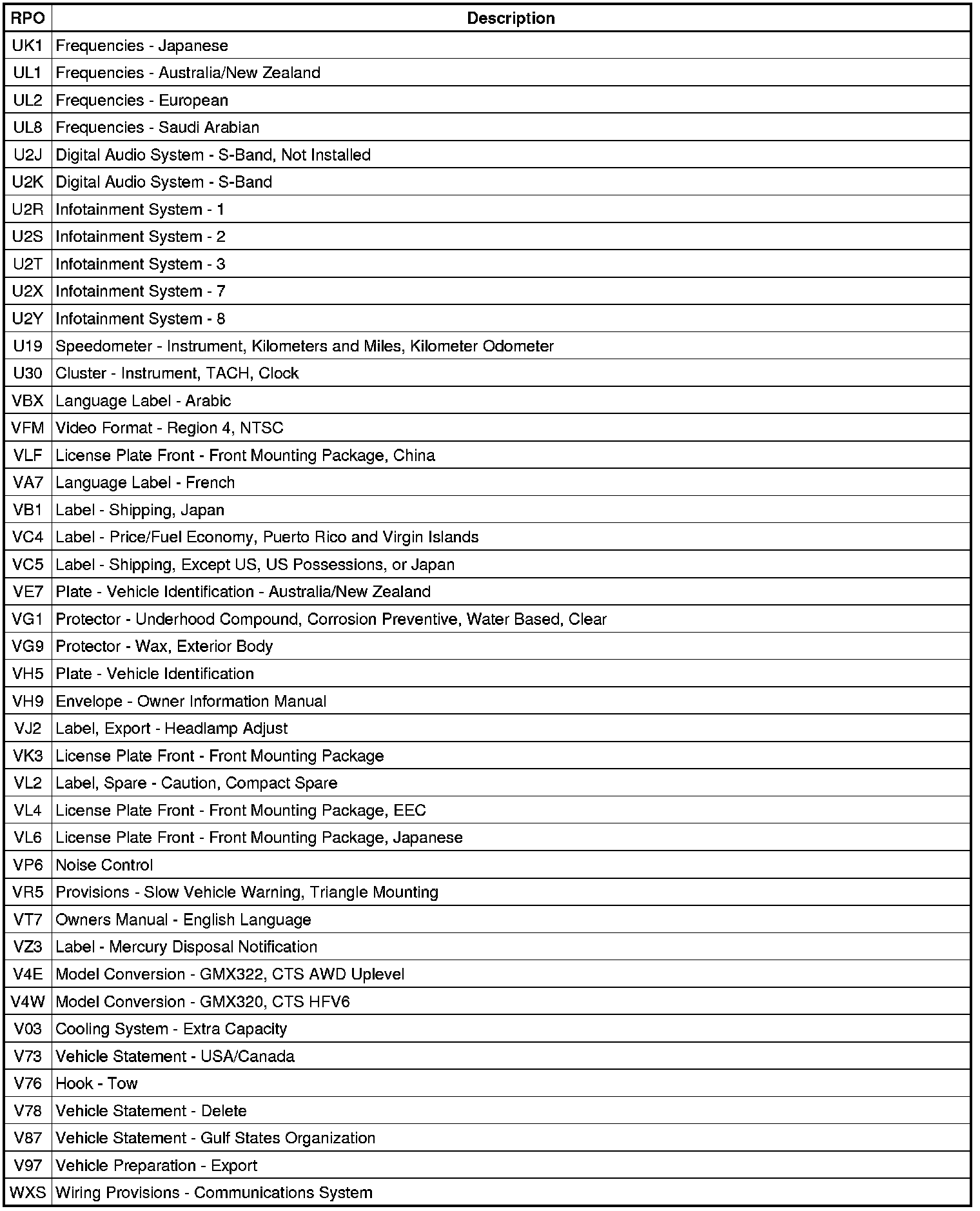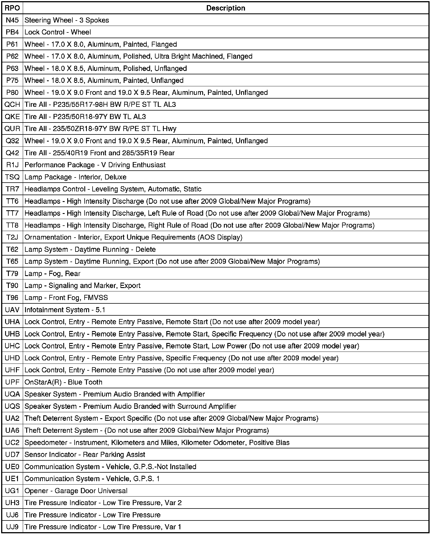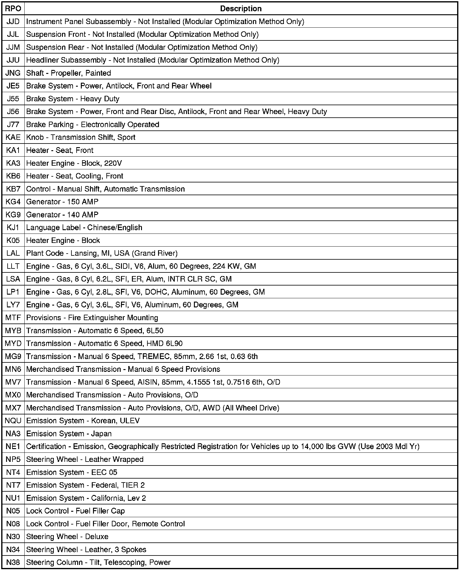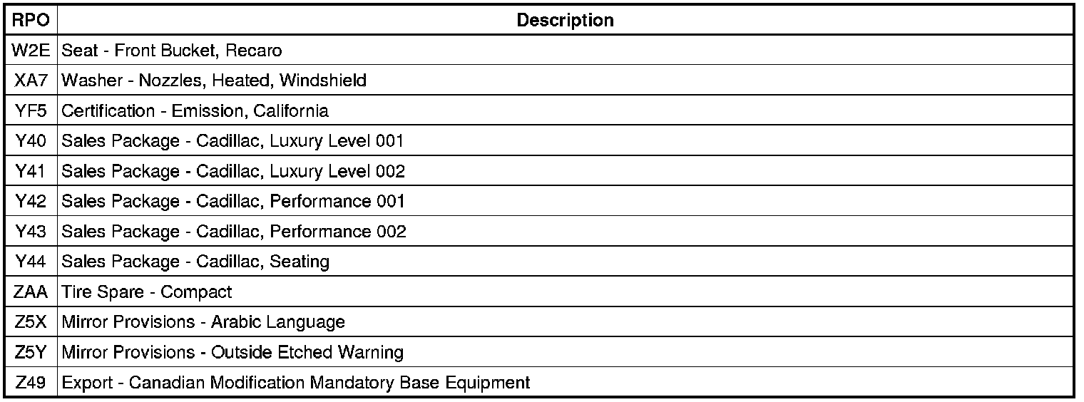 The following table provides the description of the regular production option (RPO) codes that are available on the vehicle. The vehicle's RPO list is printed on the Service Parts Identification Label.