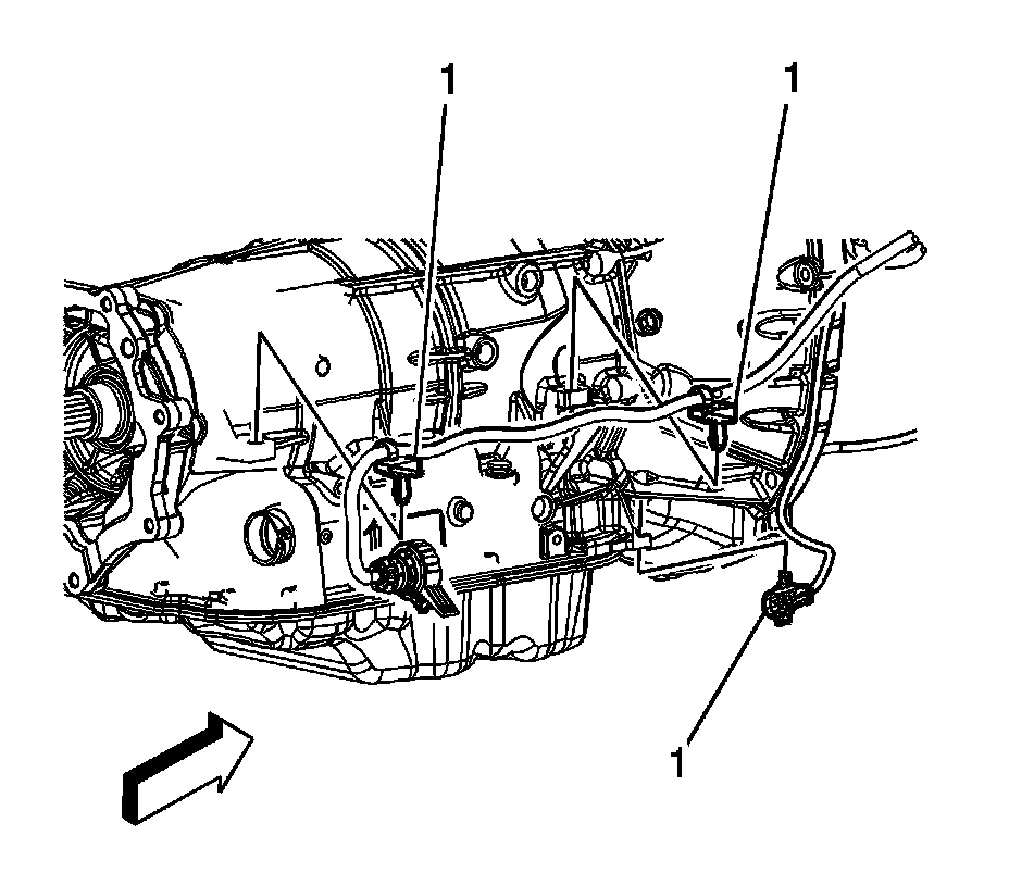 55. Install the engine harness to transmission retaining clips (1).