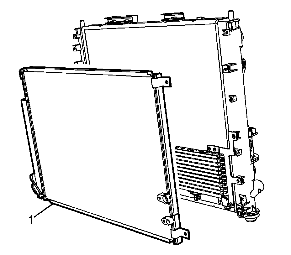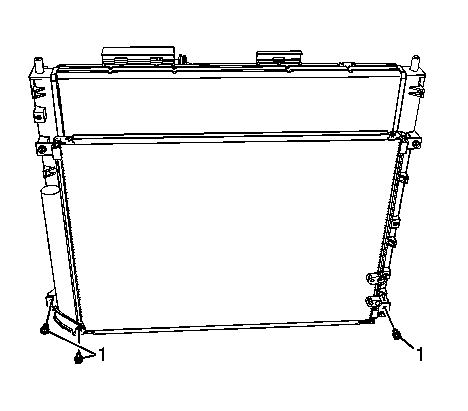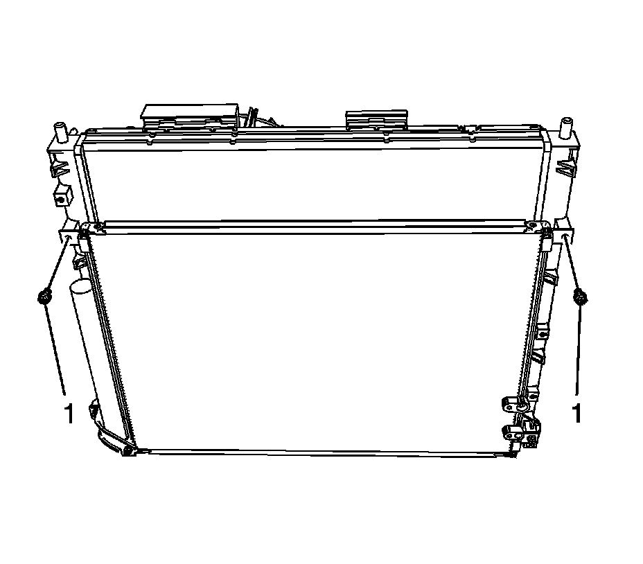 9. Install the condenser lower mounting bolts (1) and tighten to 5.4 Nm (48 lb in).