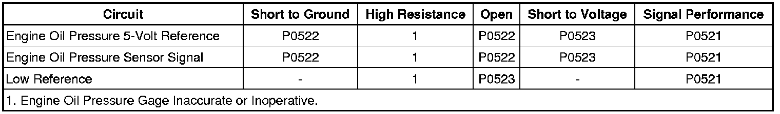 The engine oil pressure (EOP) sensor changes voltage based on the engine oil pressure. The EOP sensor is a 3-wire sensor comprising of the signal circuit, the low reference circuit and the 5-volt reference circuit. The engine control module (ECM) supplies 5 volts to the EOP sensor via the 5-volt reference circuit and provides ground via the EOP low reference circuit. The ECM monitors the signal circuit of the EOP sensor to determine the engine oil pressure sensor voltage is within the normal operating range of approximately 1-4 volts. When the engine oil pressure is high, the EOP sensor voltage is high and the ECM senses a high signal voltage. When the engine oil pressure is low, the EOP sensor voltage is low and the ECM senses a low signal voltage. The ECM sends the EOP information to the instrument panel cluster (IPC) via the serial data circuit.