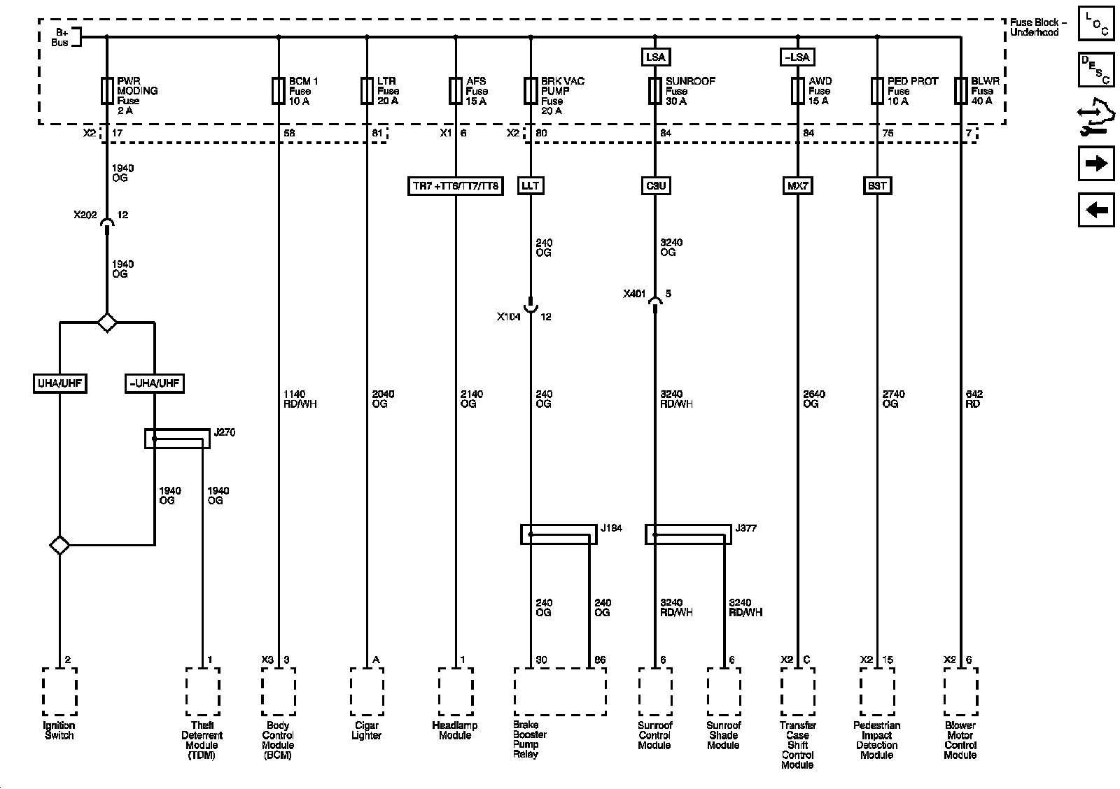 AFS, AWD, BCM1, BLWR, CIG, PED PRO, PWR MODING, and TRANS PUMP Fuses