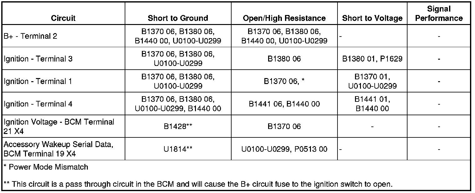 BCM senses an open on the B+ circuit to the ignition switch while the engine is running. An open on the B+ circuit can be caused by a short to ground on any of the circuits listed below: