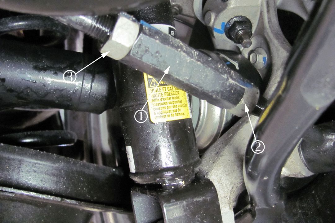 22. Hold the rear suspension adjustment link with a 21 mm (13/16 in) open end wrench and tighten the jam nuts to 90 Nm (66 lb ft).