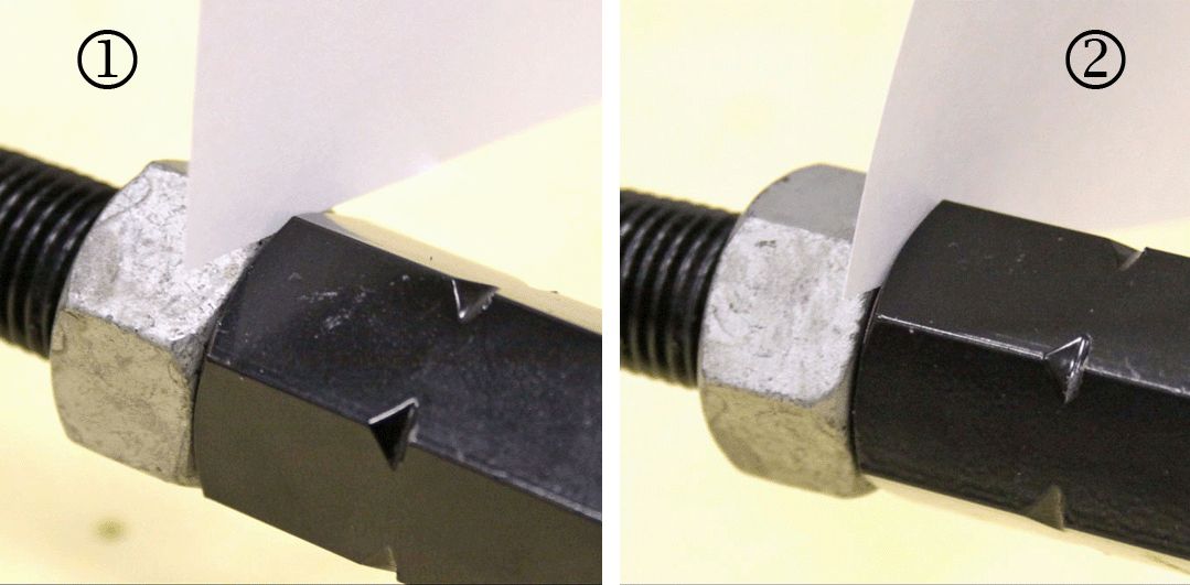 (1) Paper does NOT fit between jam nut and rear suspension adjustment link. (2) Paper fits between jam nut and rear suspension adjustment link.