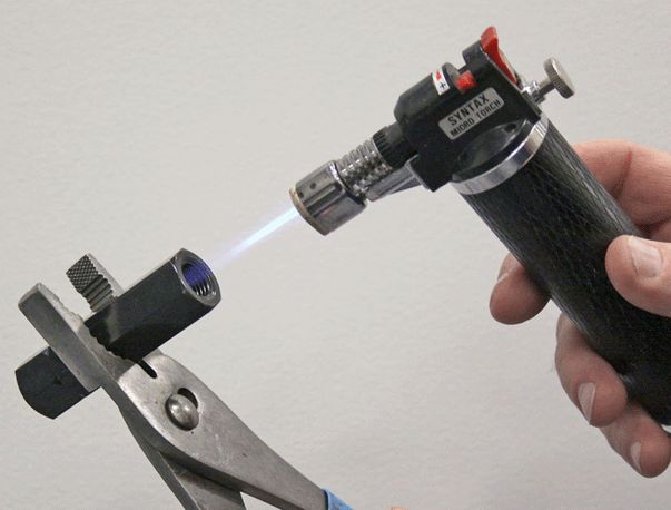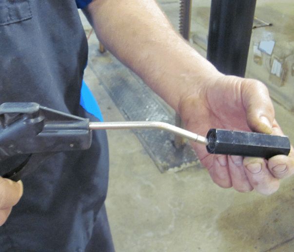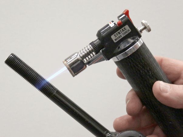 8. Using a BLAZER Micro Torch or equivalent, evenly apply heat directly on the inside threads and the end faces of the adjustment link for 15 seconds.